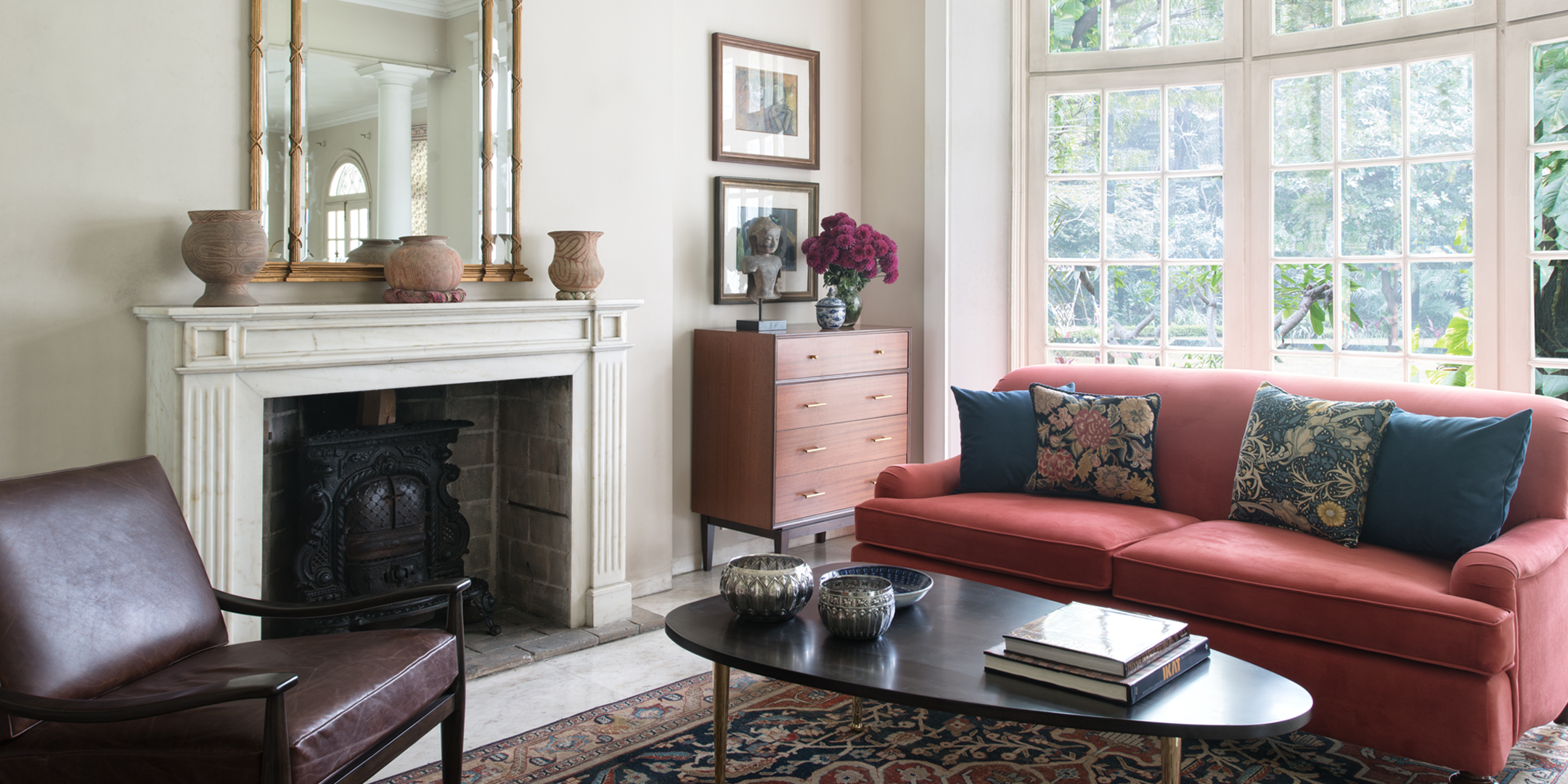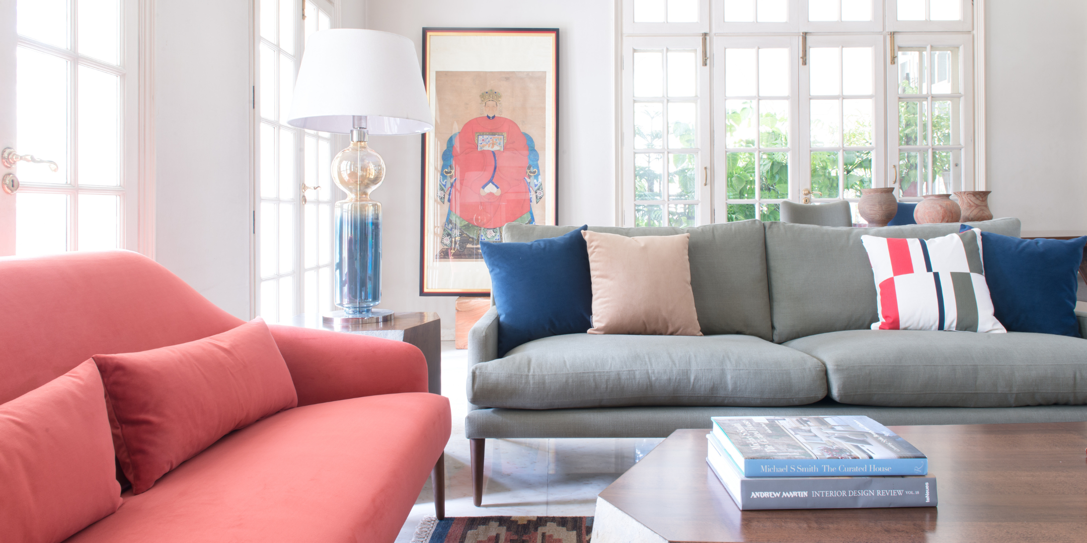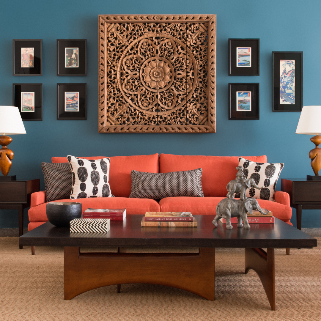 Visit UsThis bold space draws inspiration from a statement wood-carved centerpiece, complemented by a dramatic red sofa that amplifies the room's energy. A deep blue was chosen for the wall to create a striking backdrop for the sofa and artwork.