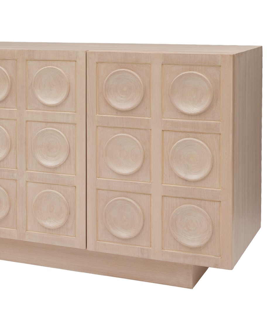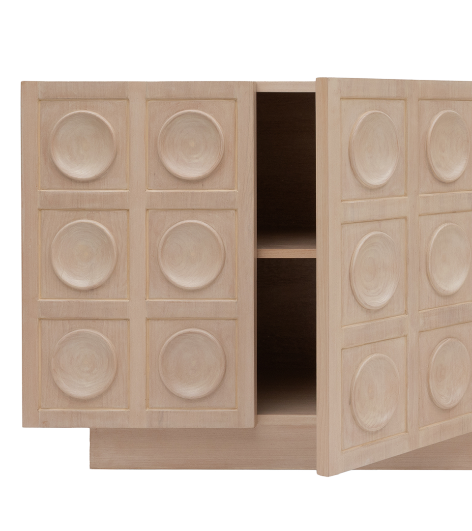 Inspired by the art of gathering together and the quiet ritual of cocktail hour, the Martini Sideboard celebrates form, texture, and purpose. Its circular relief turns a simple cabinet into a moment of quiet celebration.