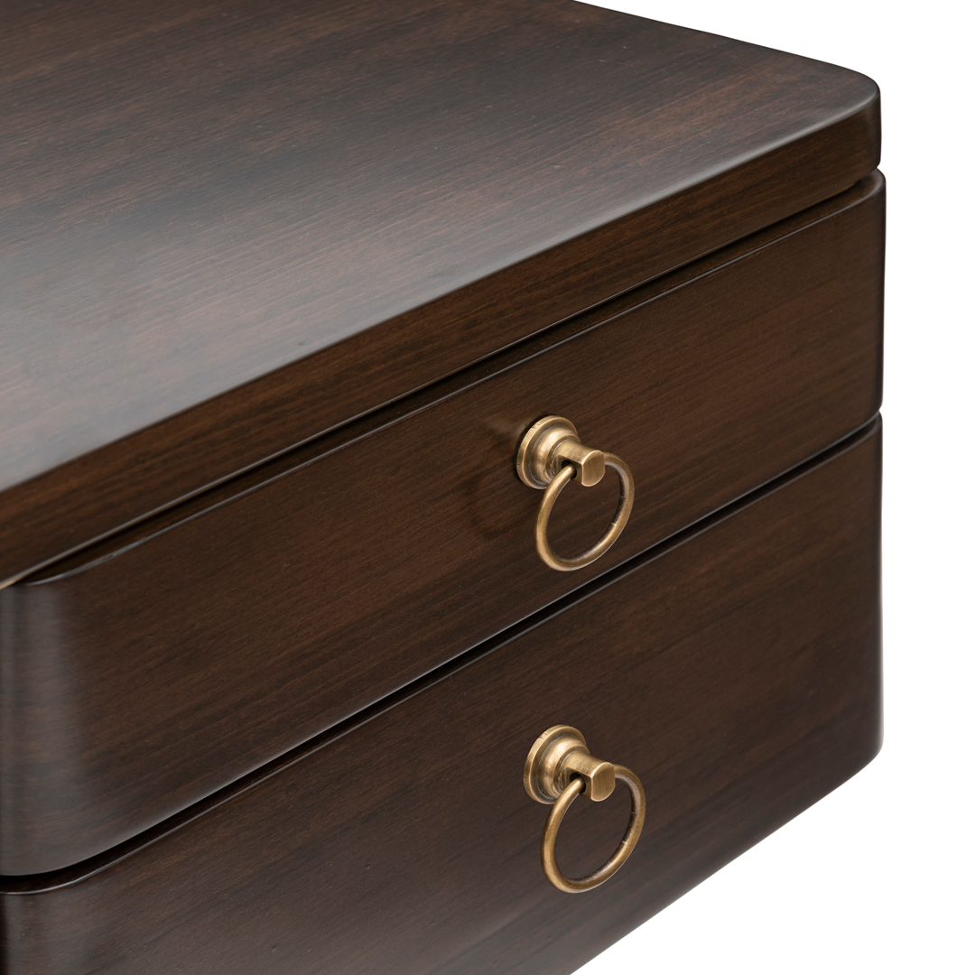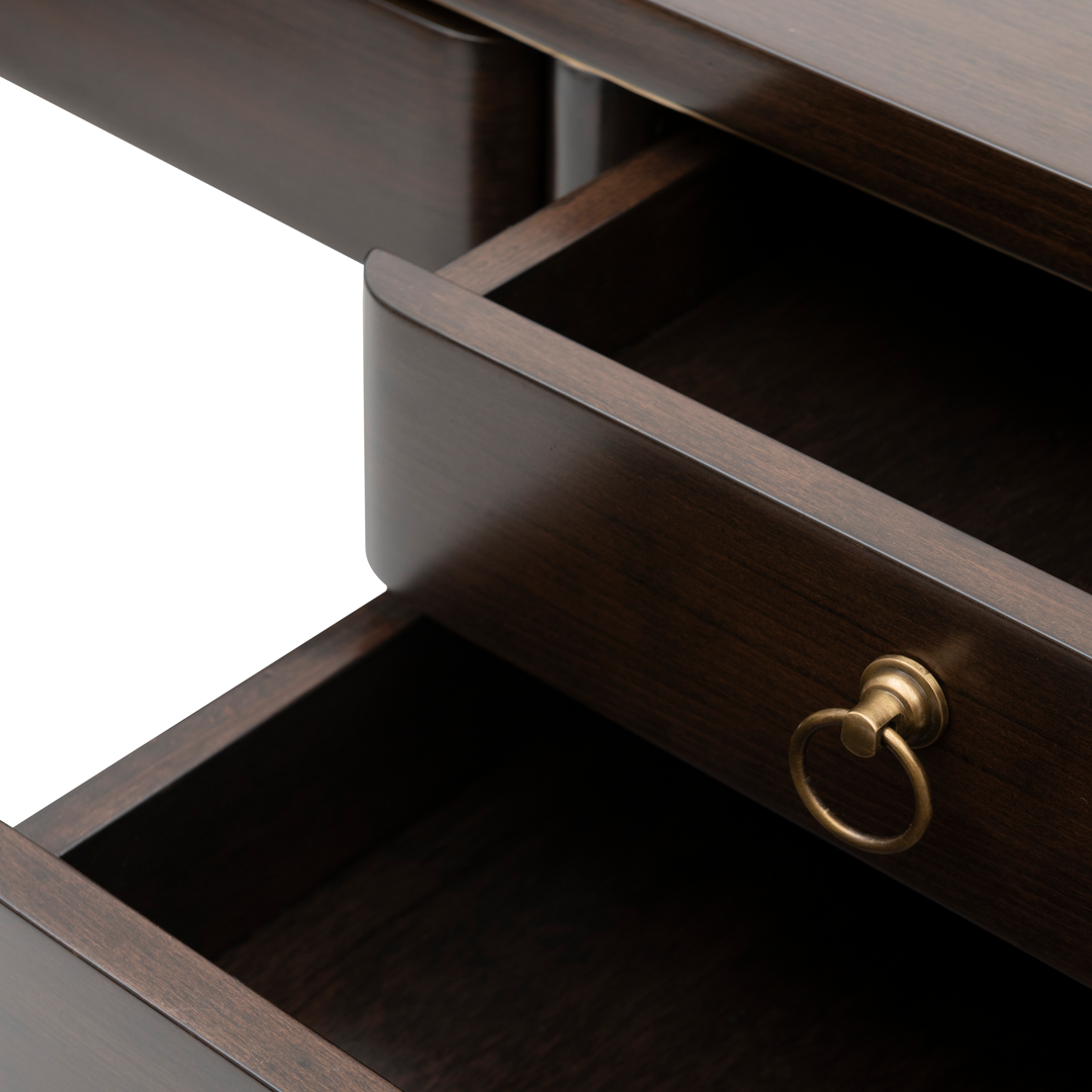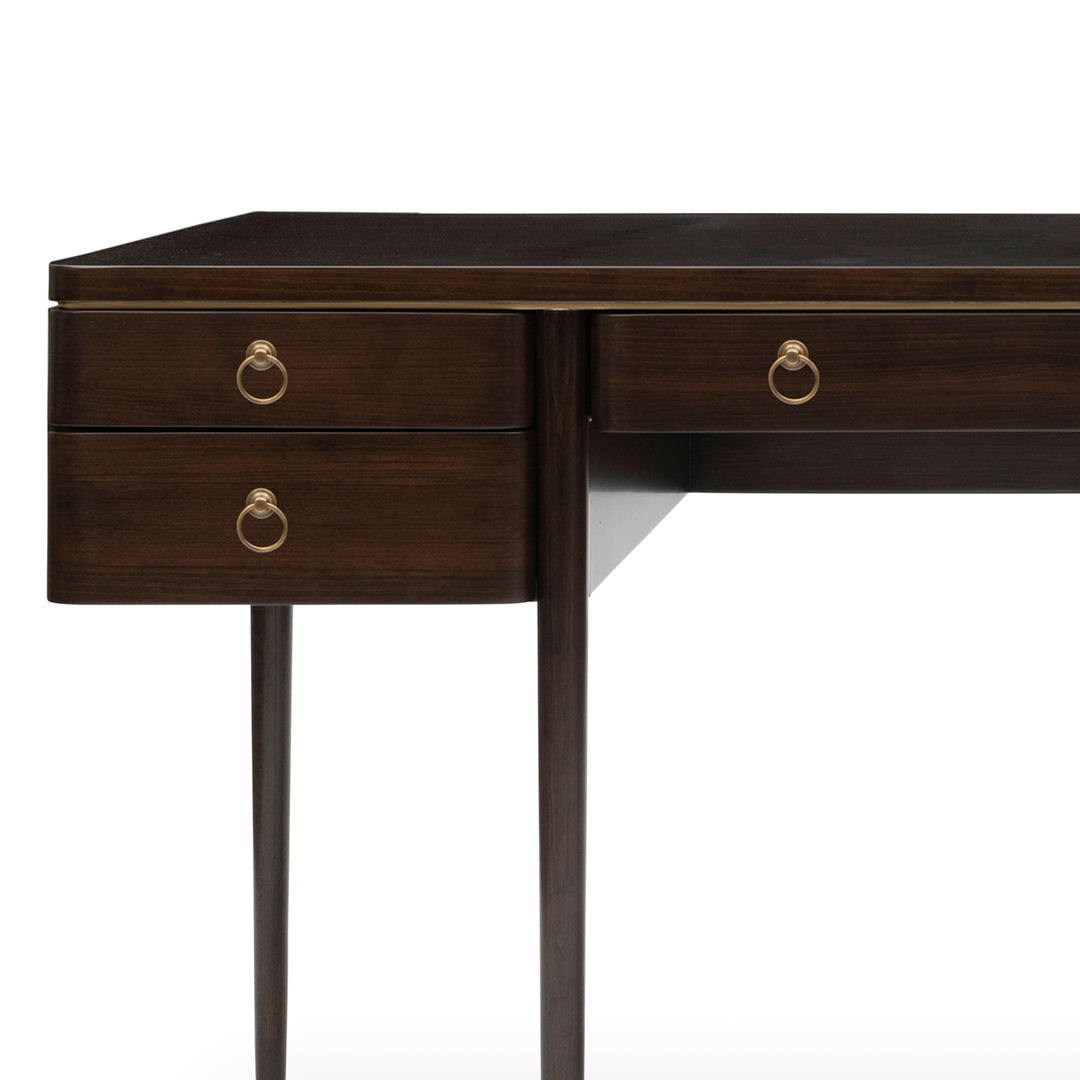 The Benjamin Desk is where craftsmanship meets clarity. Sleek lines and tapered legs support a generous work surface, while drawers provide functional grace. Photographed in weathered black with gold-lined interiors and brass knobs, it brings subtle luxury to productivity. A desk that performs beautifully.