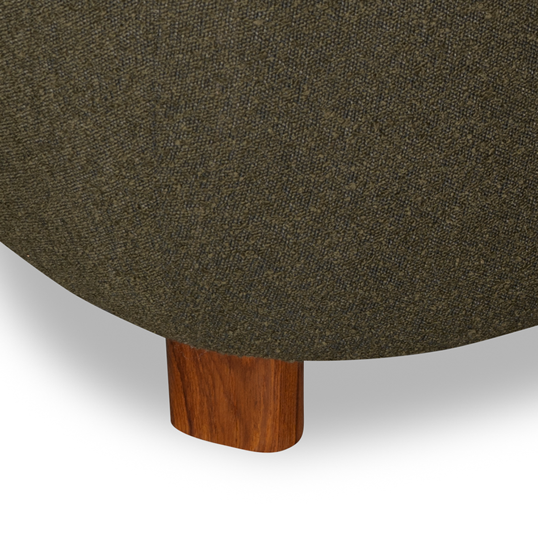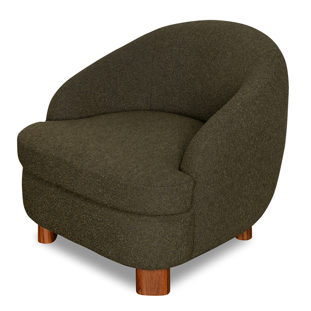 Inspired by a cocooning embrace and mid-century refinement, the Monroe Armchair fuses a seamless, curved shell with four short wooden legs. In olive-green textured fabric, it balances depth and structure—modern comfort with architectural poise.