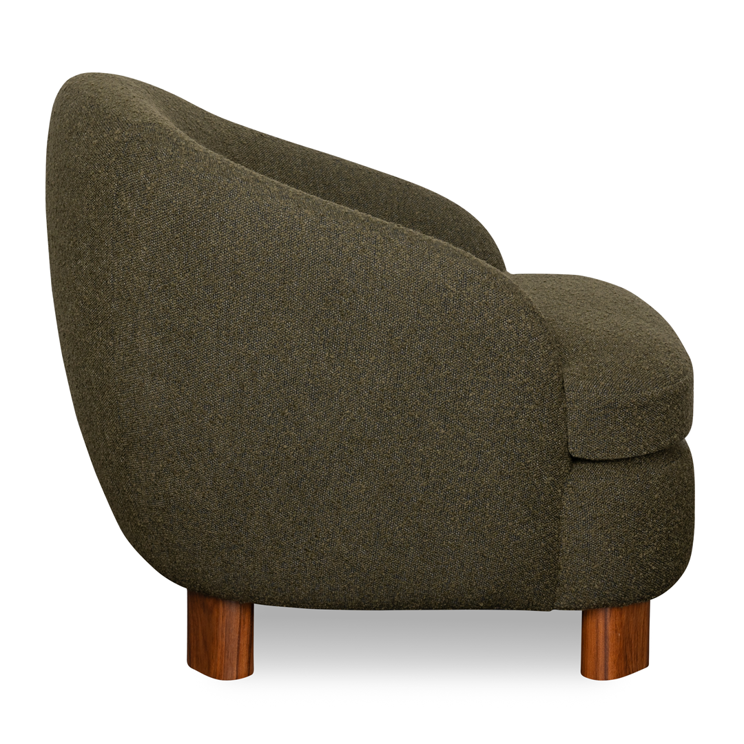 This cozy olive green armchair combines modern elegance with comfort through its distinctive cocoon-like shape. Featuring a seamless curved design that wraps around the sitter, it sits atop four short wooden legs in a warm finish. The textured fabric adds depth to its sophisticated silhouette, creating a perfect balance of inviting comfort and contemporary style.