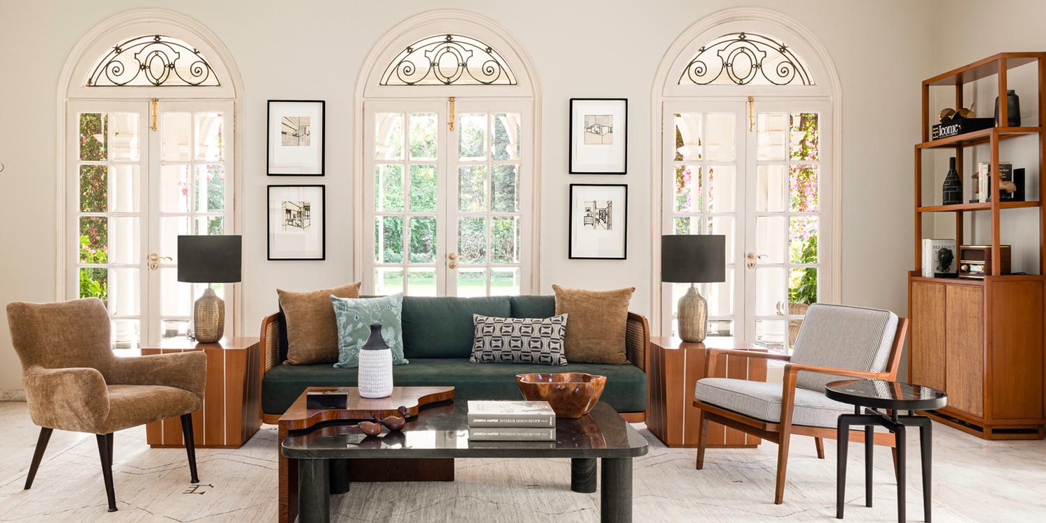 Step into a scene inspired by Mumbai's historic Parsi cafés, where our signature Bombay sofa with intricate rattan detailing meets the sophisticated Dunbar armchair and the striking velvet Ginger armchair - creating an inviting sanctuary that blends colonial charm with mid-century elegance.