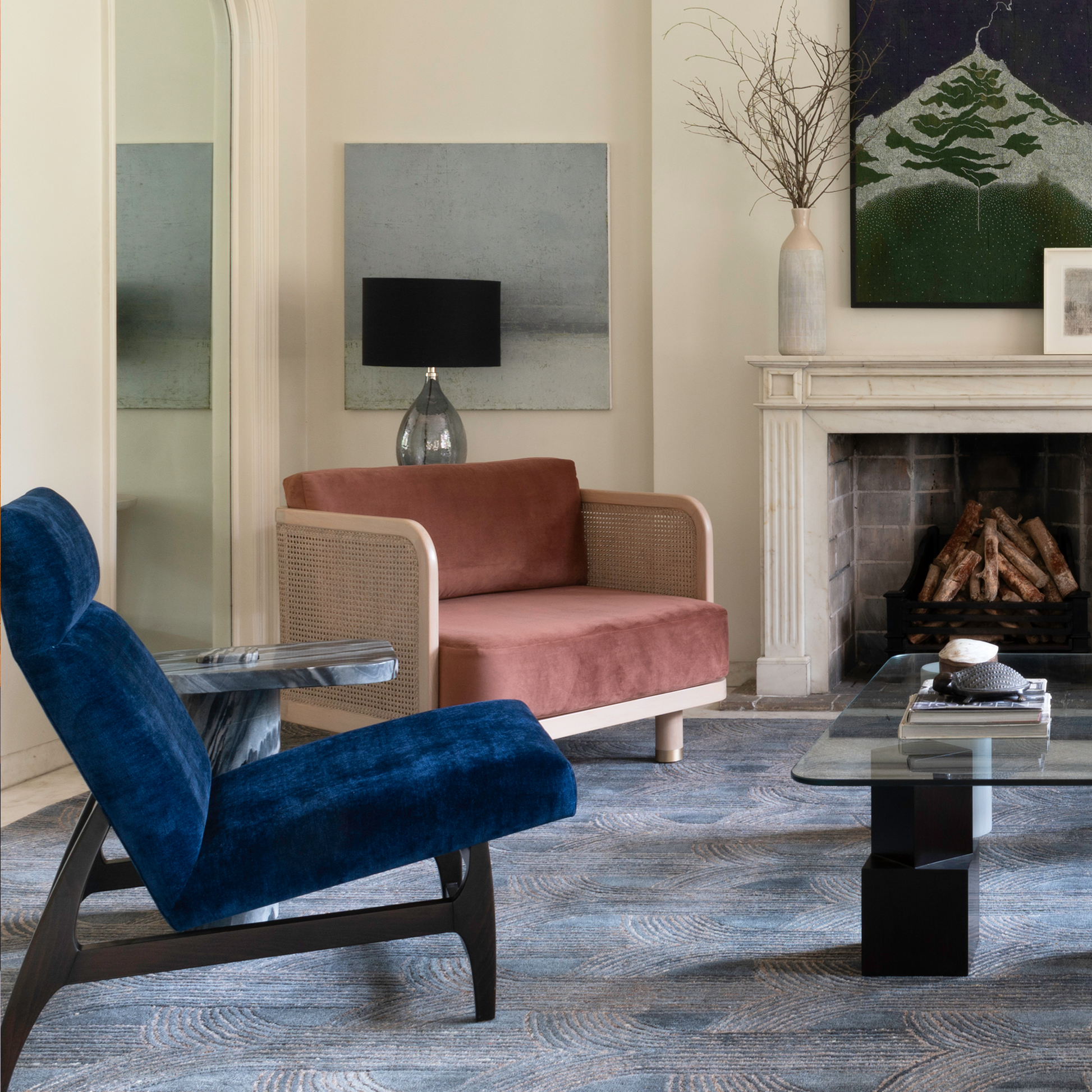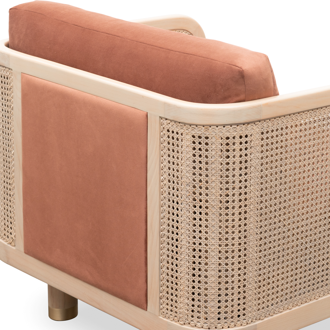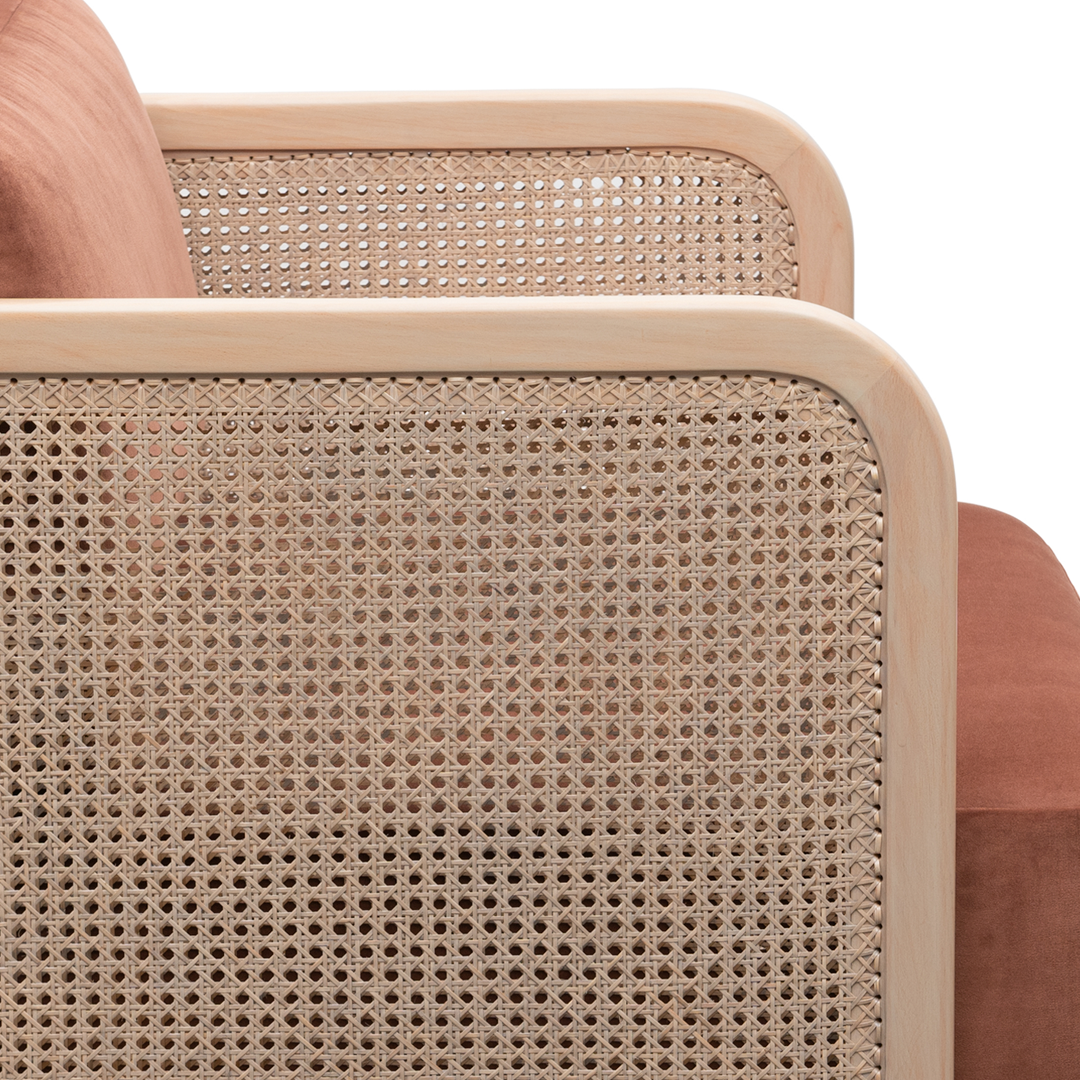 Subtle velvets are offset by rattan on the sides that wraps around its back.