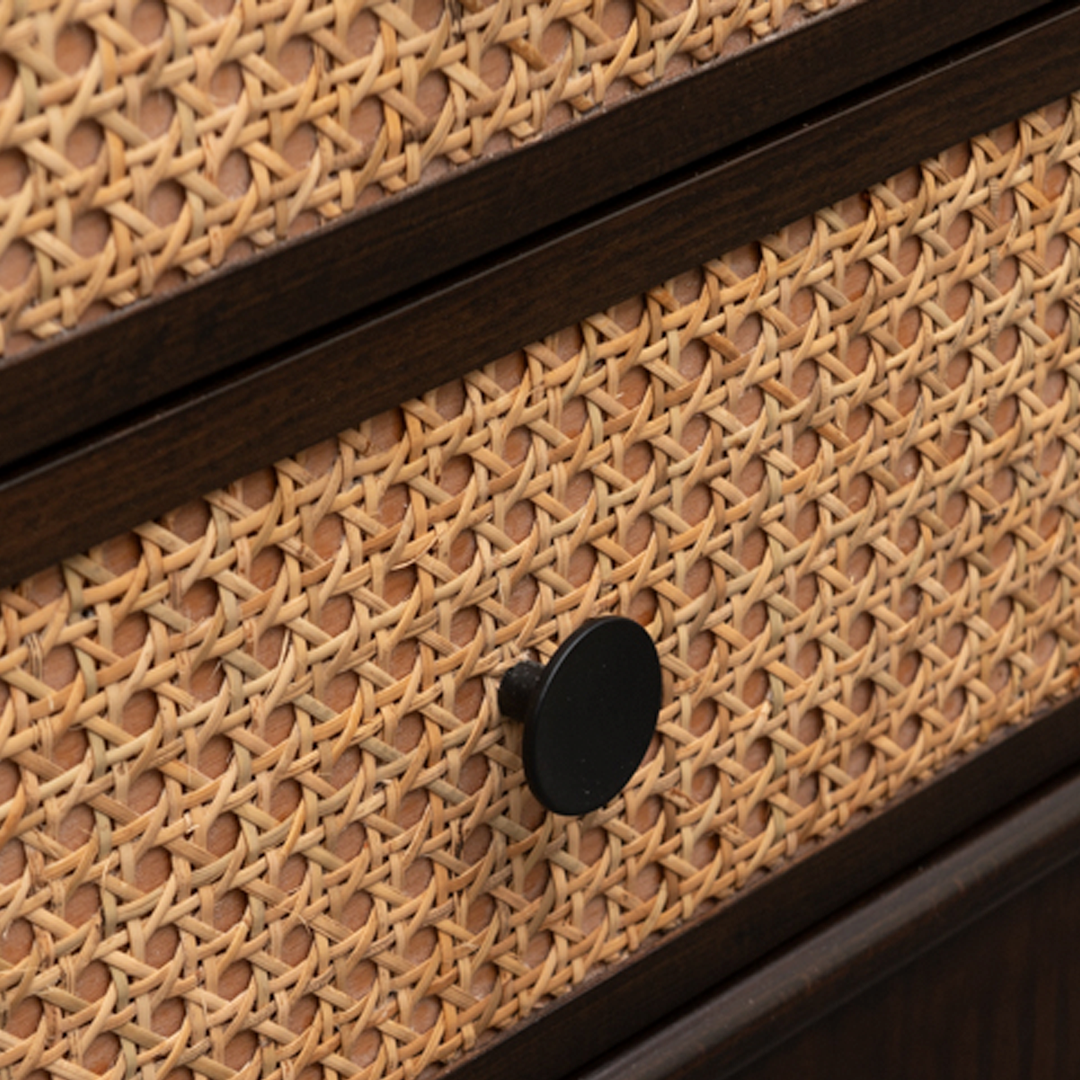 Subtle velvets are offset by rattan on the sides that wraps around its back.