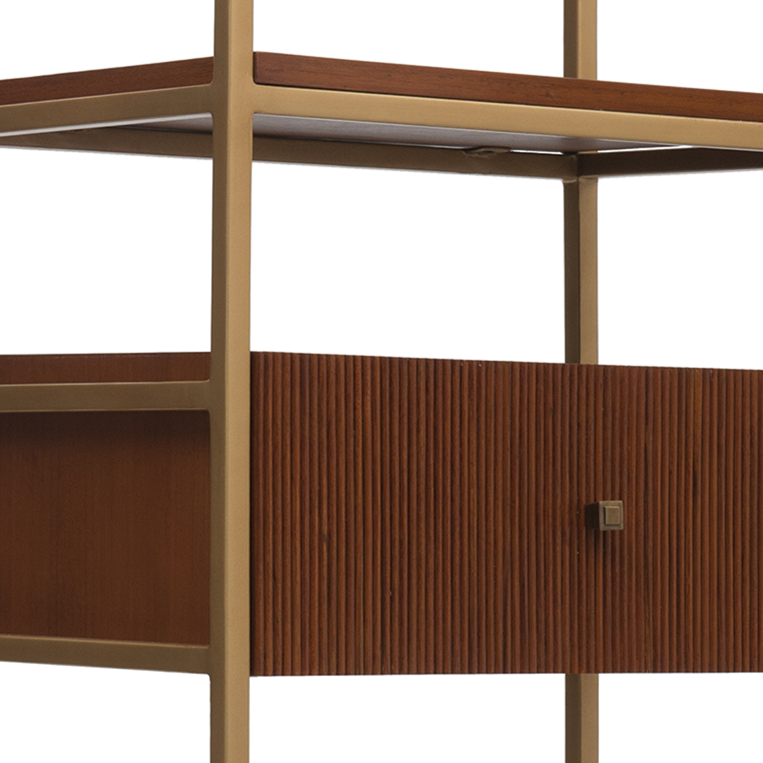 Completing the Chandigarh series, the 1‑Shelf unit captures the collection’s essence in a compact footprint. Featuring the same teak and brass frame, it’s a refined solution for layering texture, lightness, and storage. Designed to mix and match with larger modules, it allows you to curate space with architectural purpose—where every line tells a story.