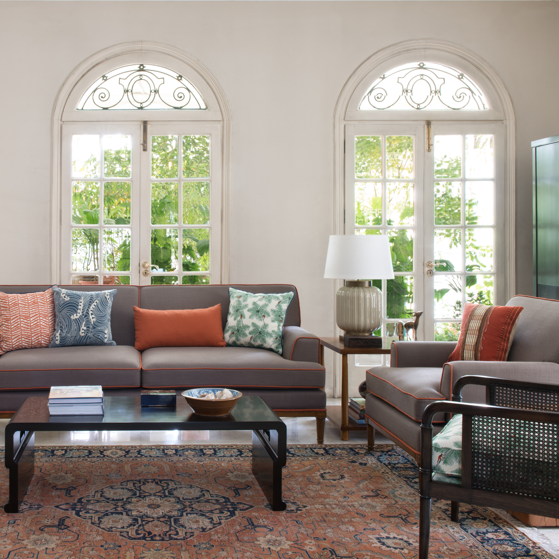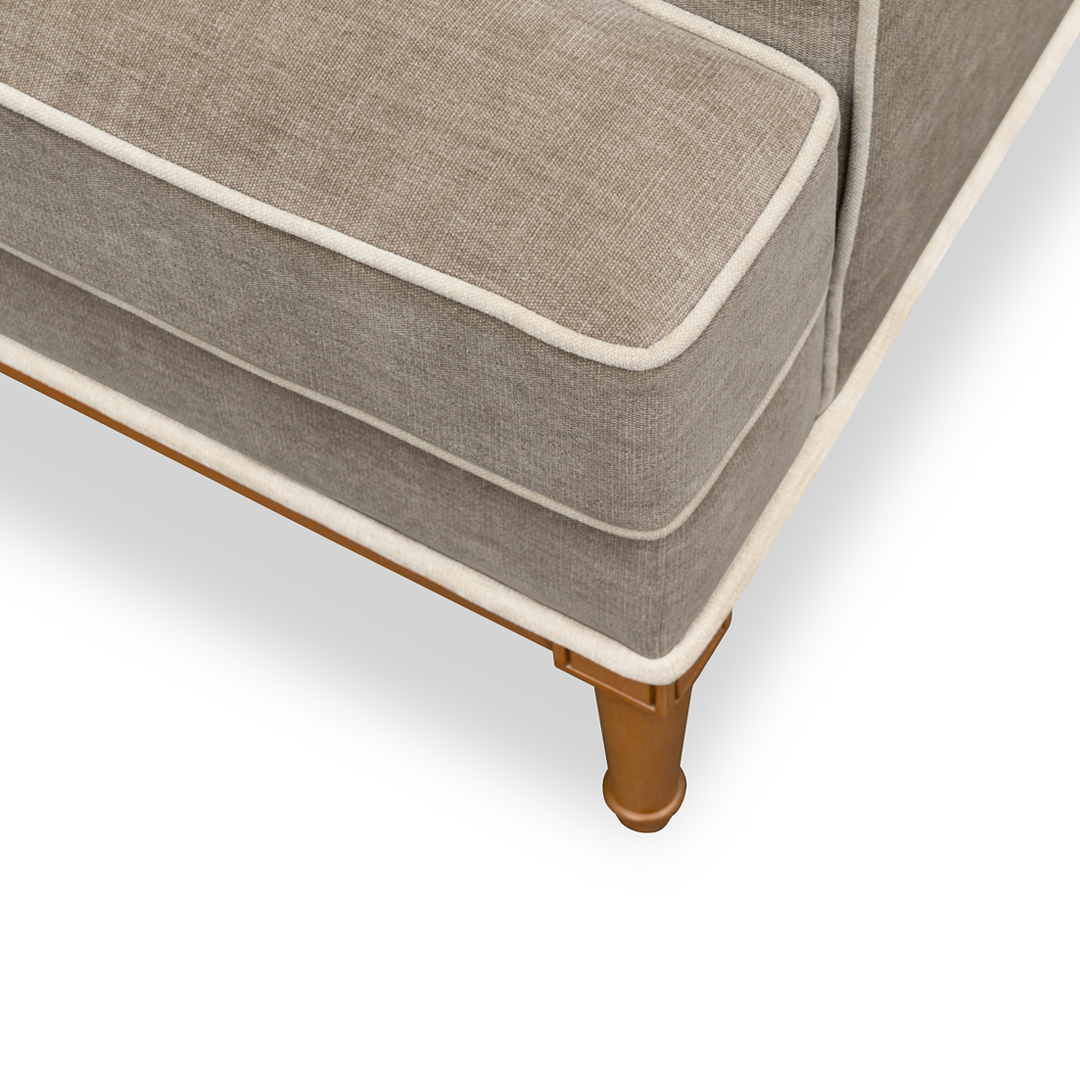 Repeated turned legs and continuous piping underscore its disciplined design language.