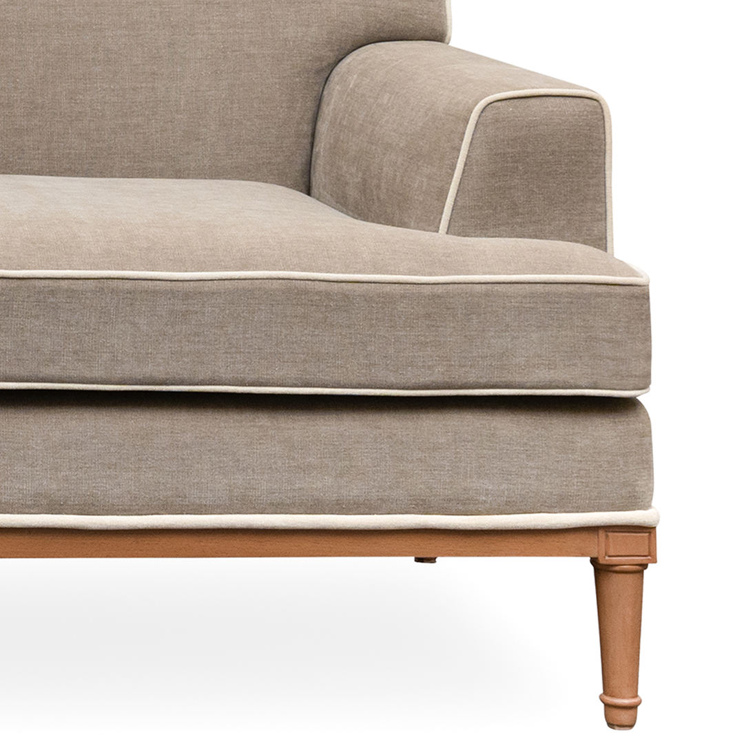 The Chelsea collection echoes tasteful elegance. Simple lines, straight and angled, work to provide an imposing form. Updated neoclassical turned legs finished in a posh elm finish and contrasting piping add the finishing touches.