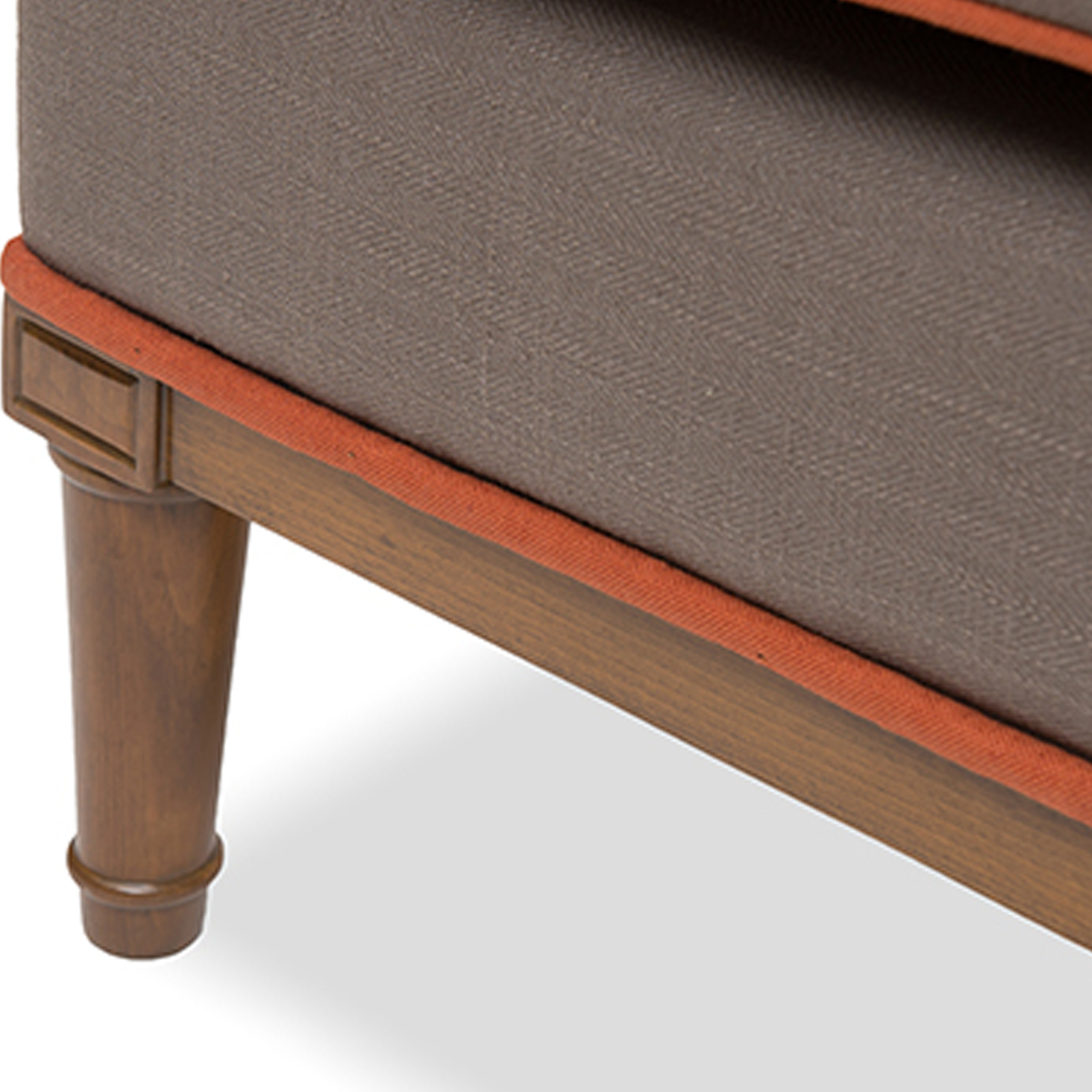 The Chelsea collection echoes tasteful elegance. Simple lines, straight and angled, work to provide an imposing form. Updated neoclassical turned legs finished in a posh elm finish and contrasting piping add the finishing touches.