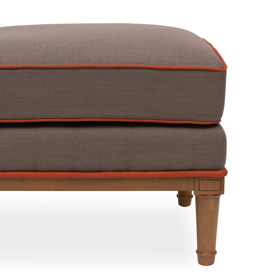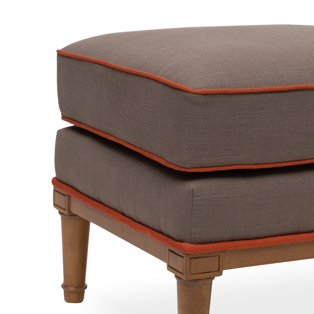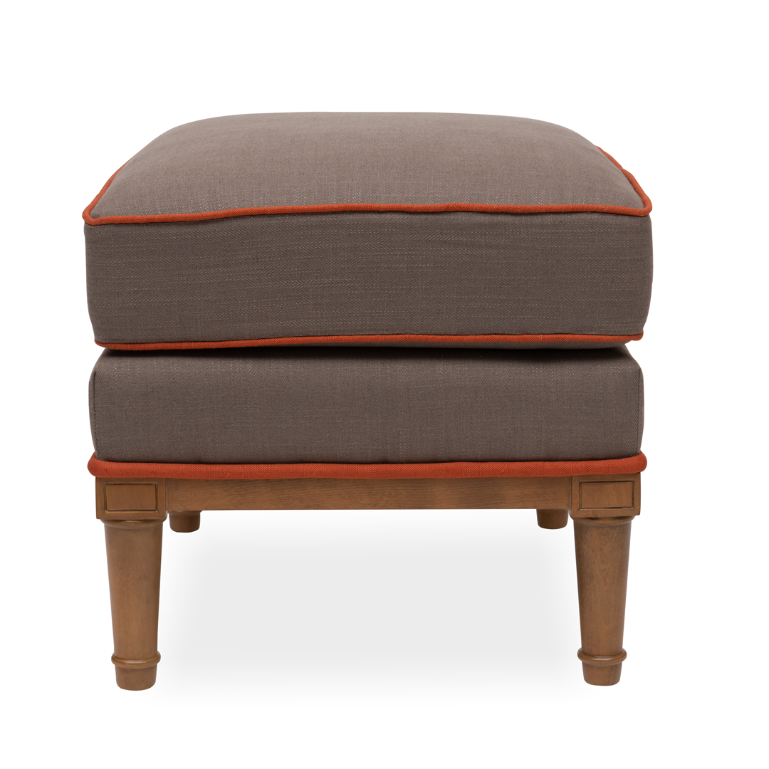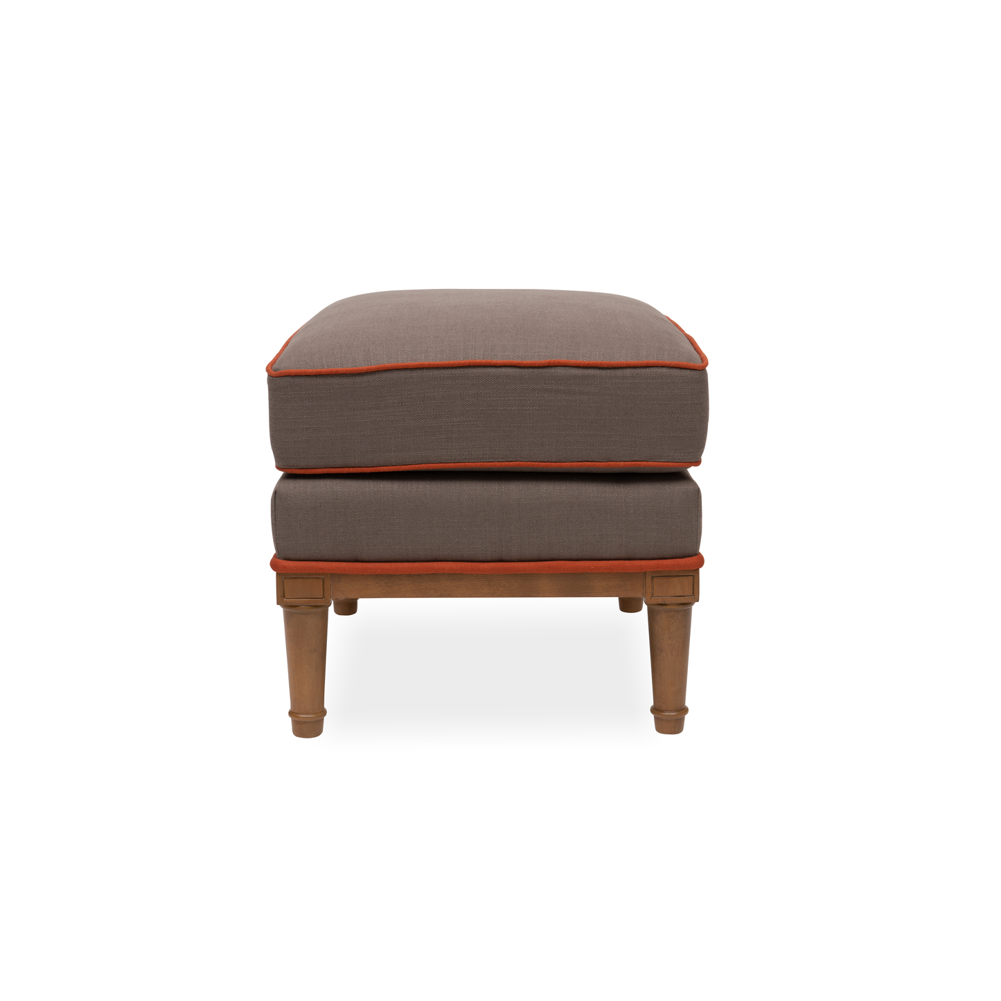 Turned legs echo the sofa’s architectural tone; piping elevates even this modest form.