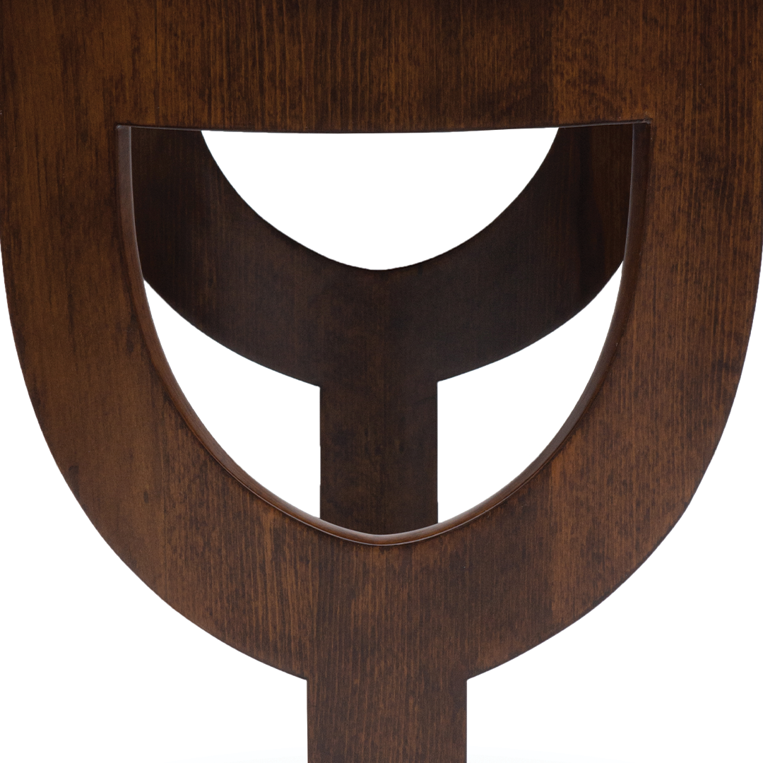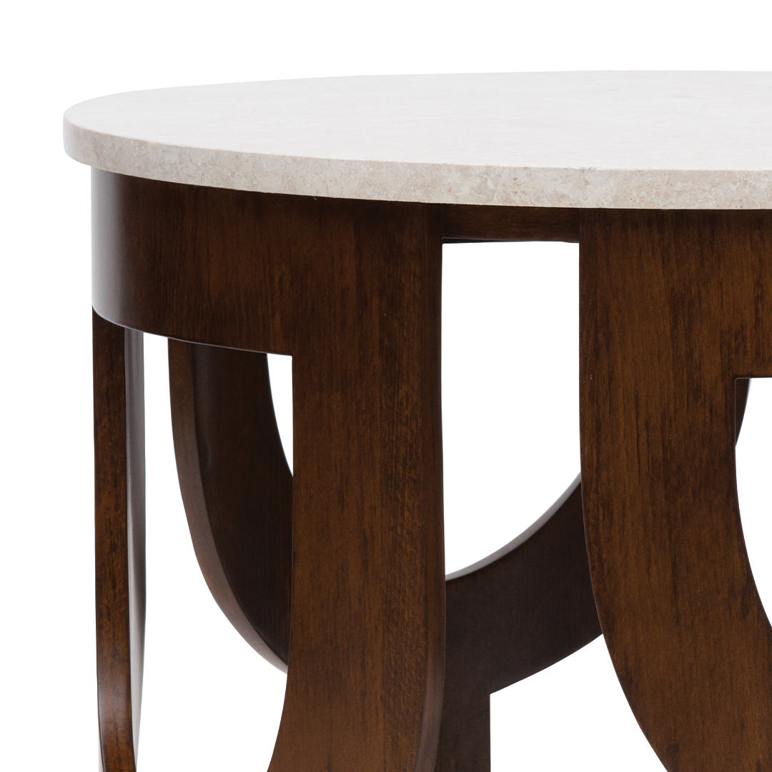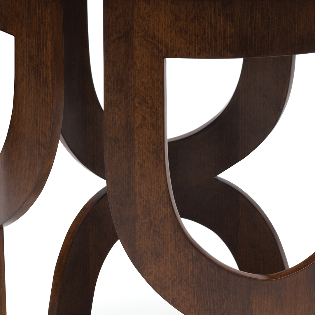 The Damascus table's distinctive base features handcrafted walnut finished arcs that create a captivating play of negative space and graceful curves. Crowned with a polished marble top, this piece offers both sophistication and functionality.
