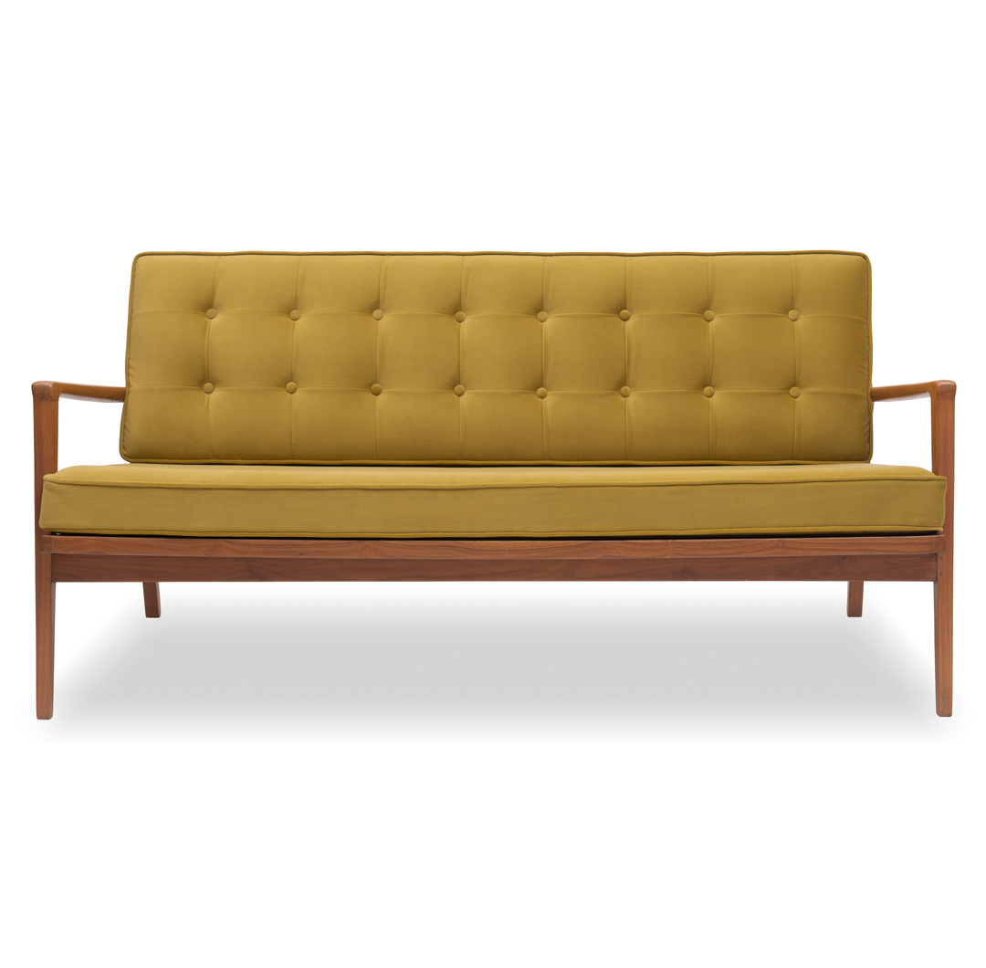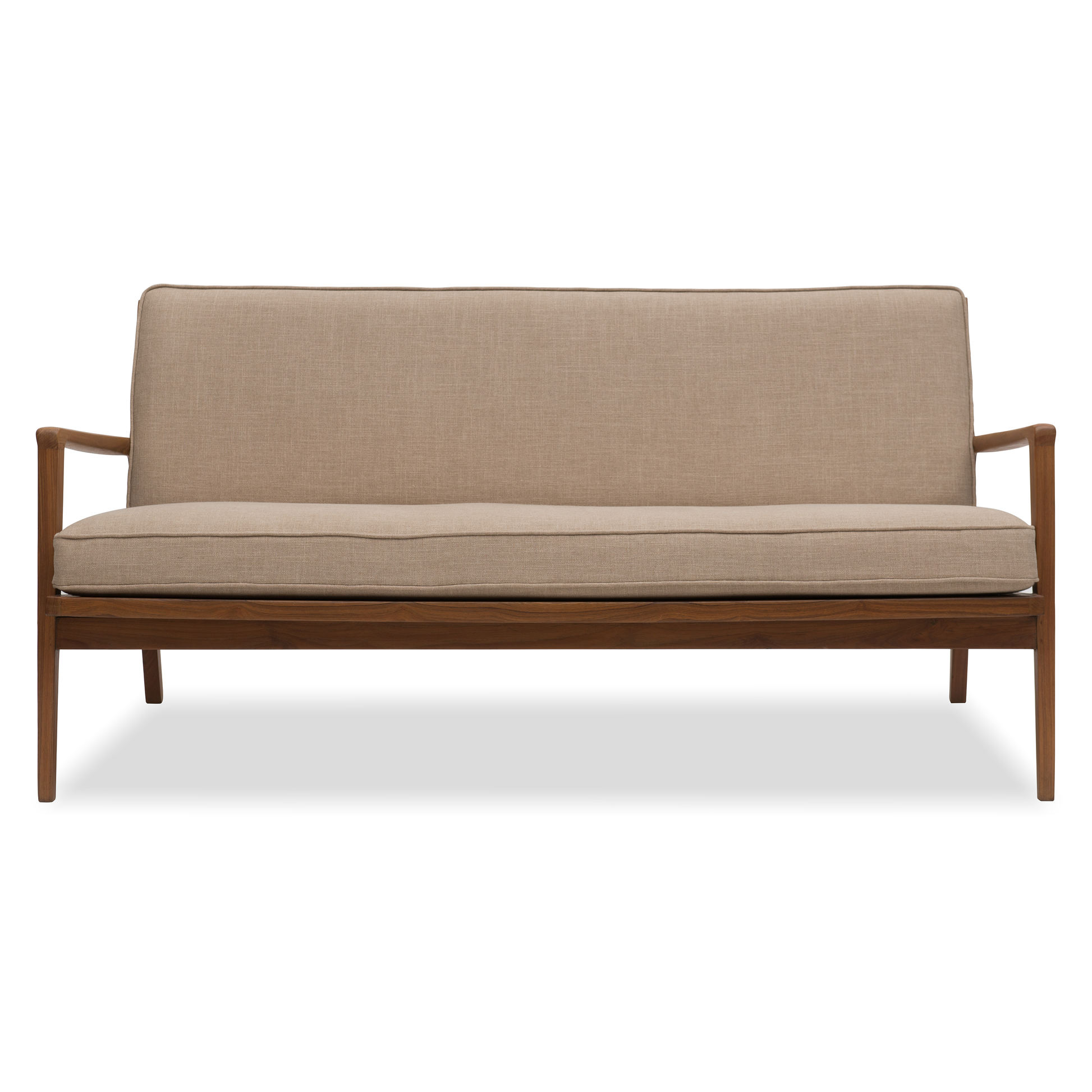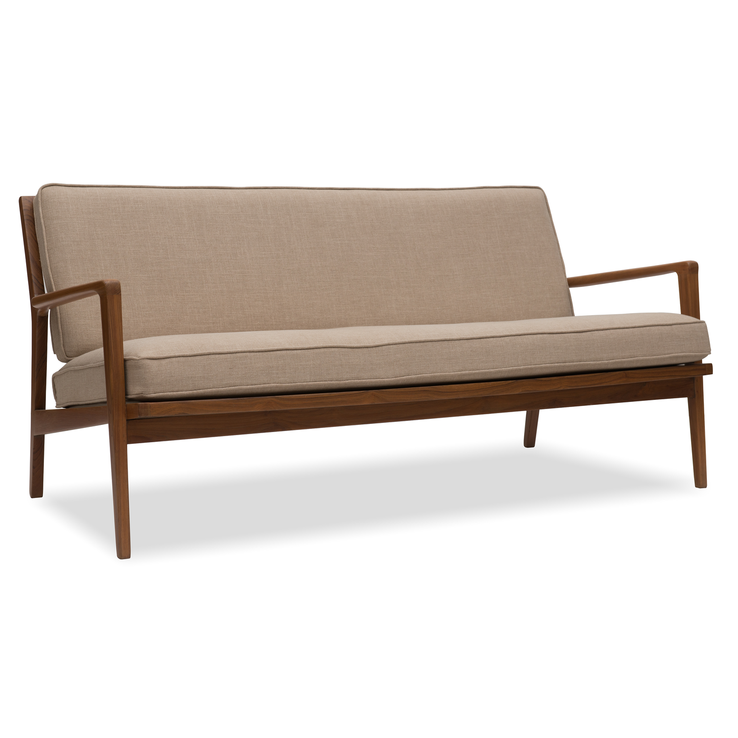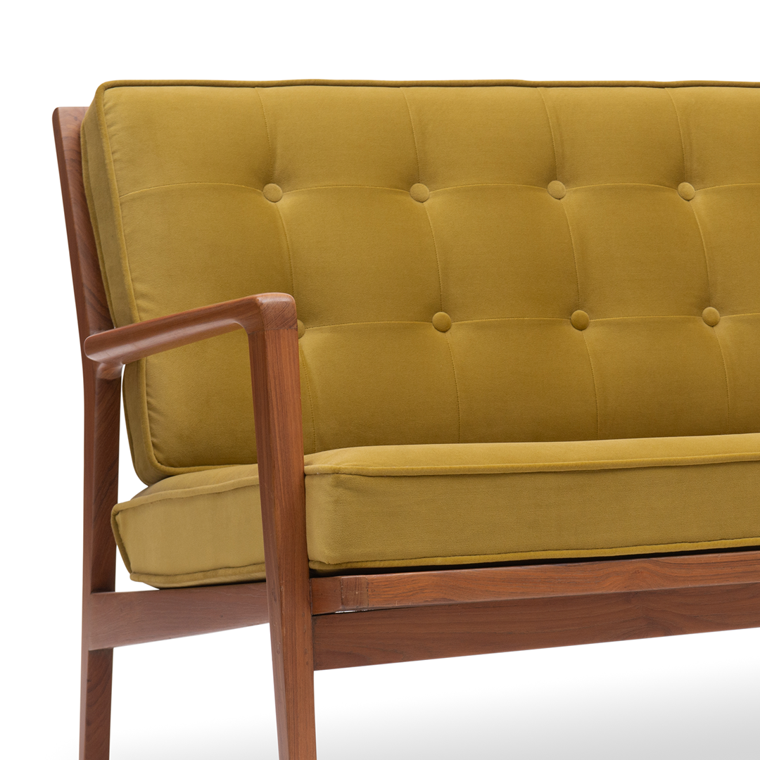 The Dunbar sofa embodies timeless mid-century modern design from the 1950s with its clean lines, tapered wooden frame, and minimalist profile. Its versatile back cushion can be ordered tufted for a classic mid-century look or smooth for a more contemporary feel. The sofa features a solid frame that highlights the natural wood grain, perfectly complementing either upholstery option.