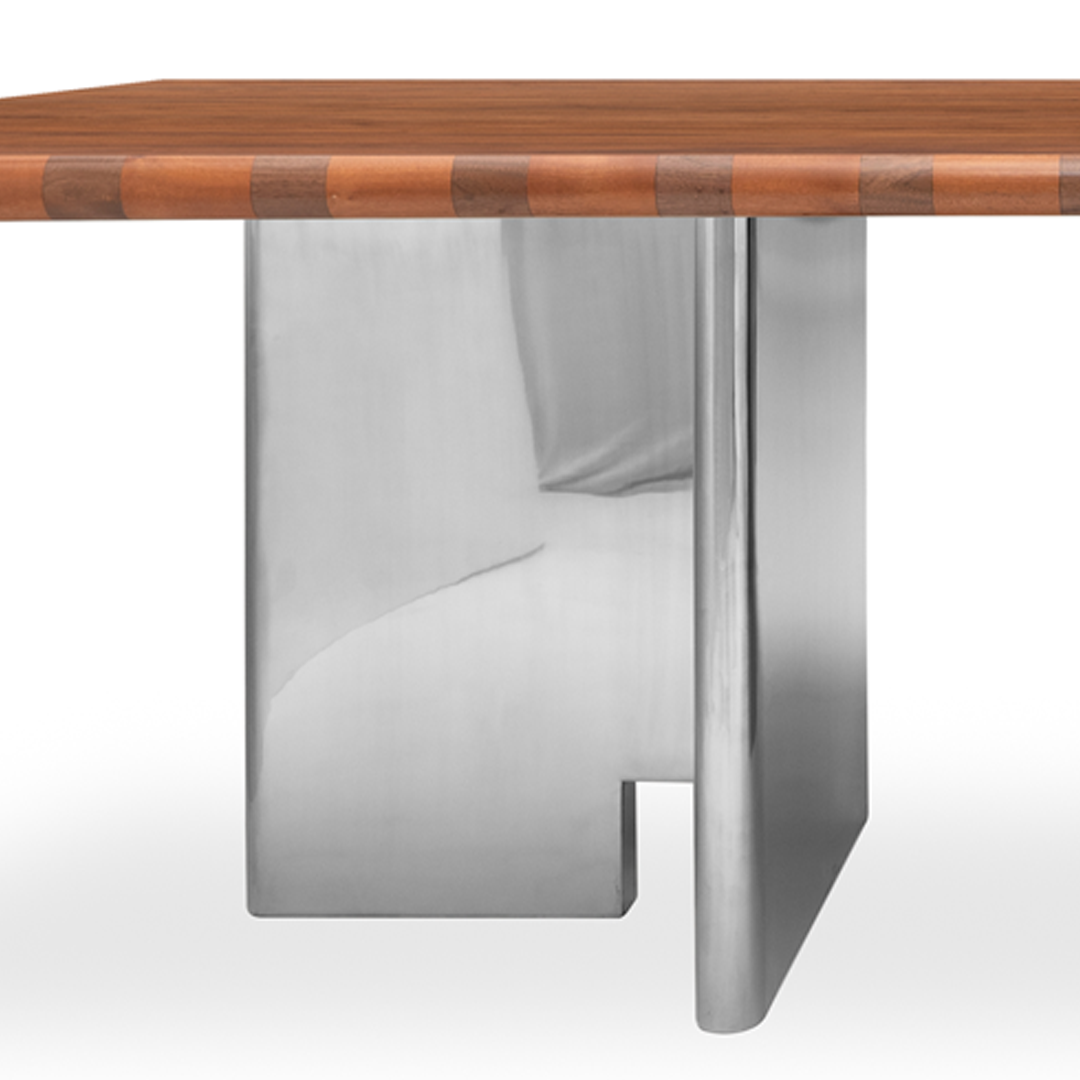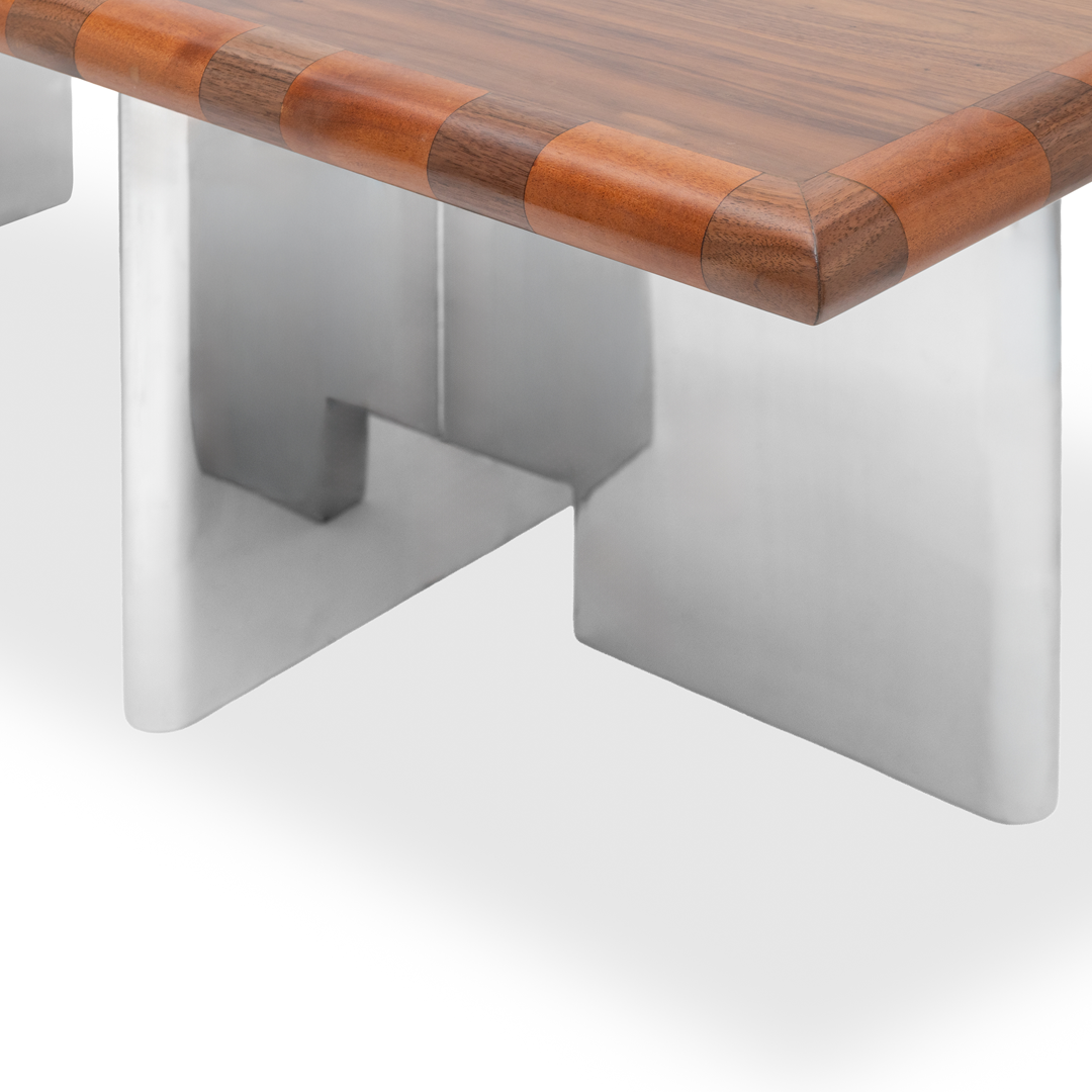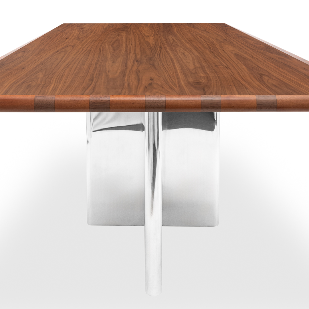 Can where you eat , what you sit on, what you wear be art? Peggy Guggenheim famously slept with an Alexander Calder silver bedhead. Like Calder's surreal headboard meals can be transportive and magical. That's what the Edge Dining Table brings, some retro magic. Complementary walnut and mahogany wood create a checkered border while architectural stainless steel legs create an imposing base.