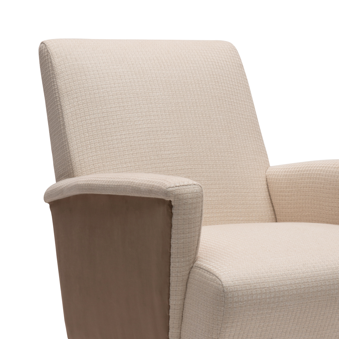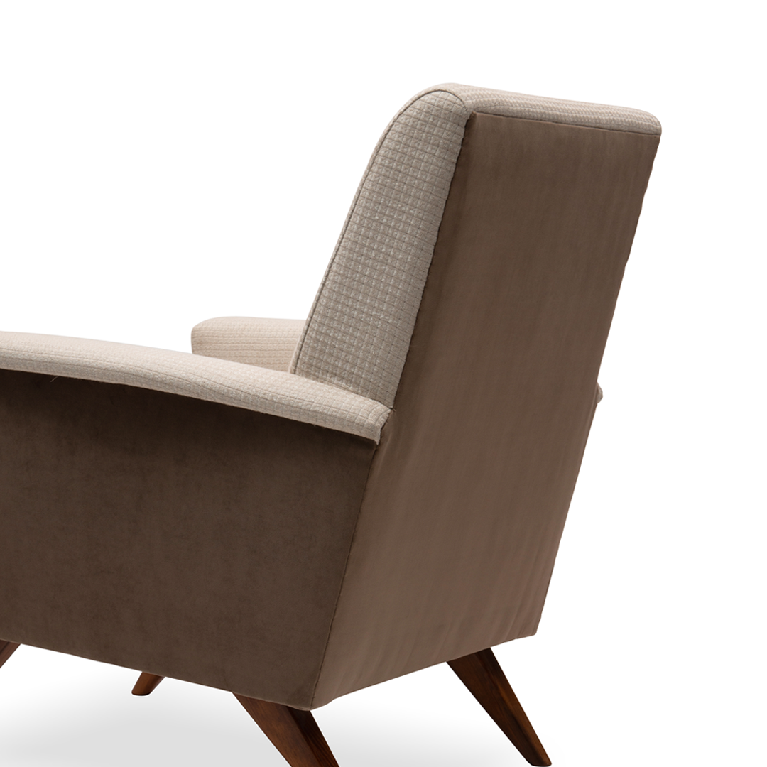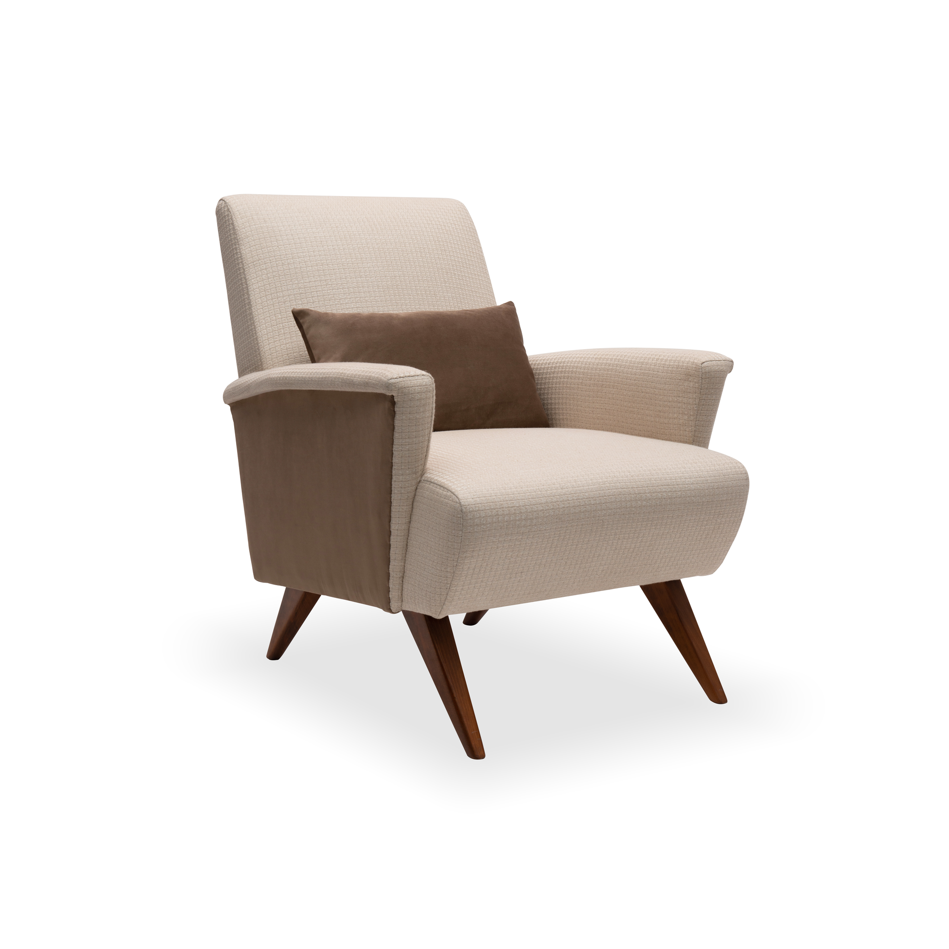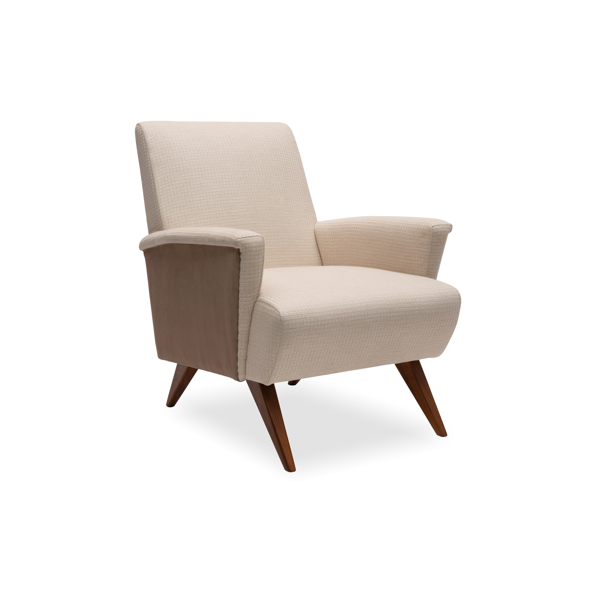 The Gigi Armchair channels Milanese restraint with subtle flair. Its clean, angled profile and sculptural legs recall 1960s glamour—but pared down for modern sensibility. Upholstered in contrasting fabrics that highlight its form, Gigi can be customized in hundreds of patterns or leathers, making it a seamless fit for curated interiors.