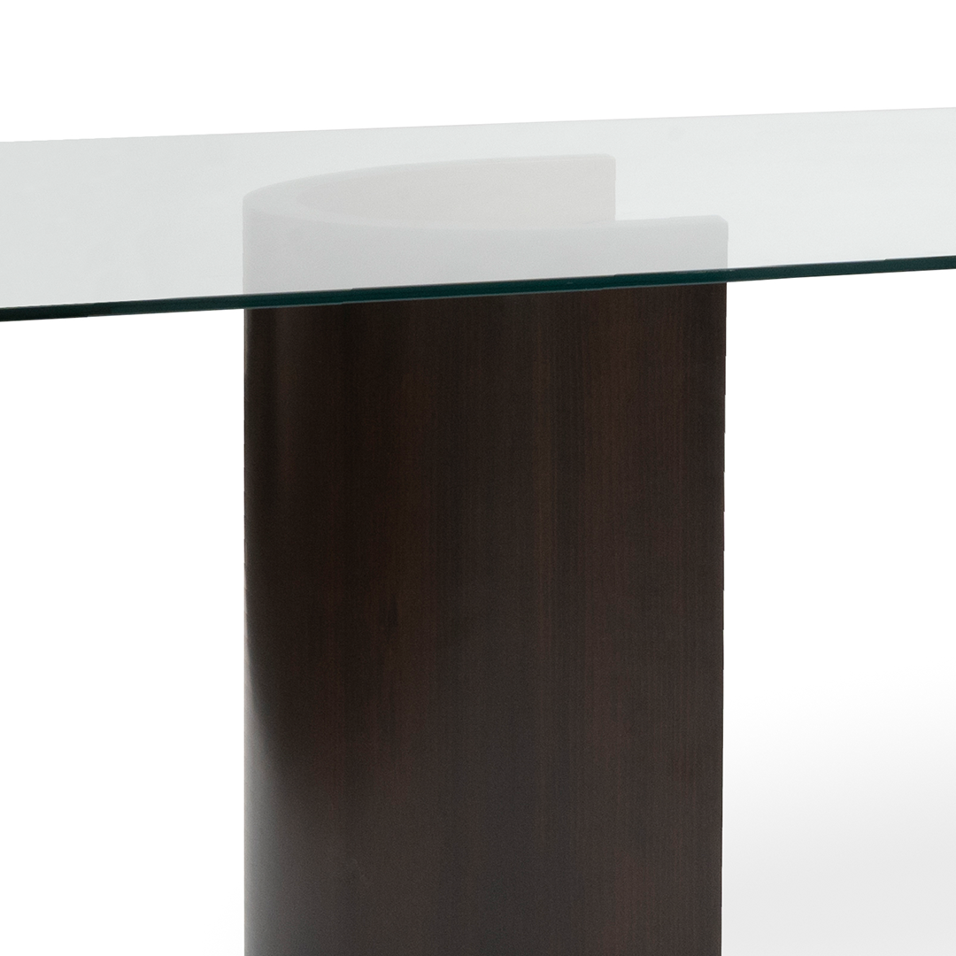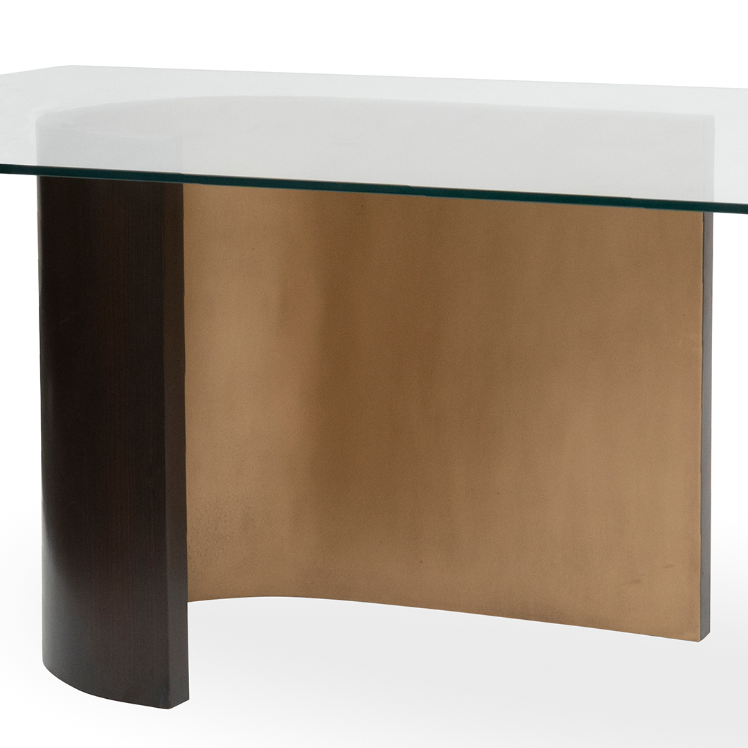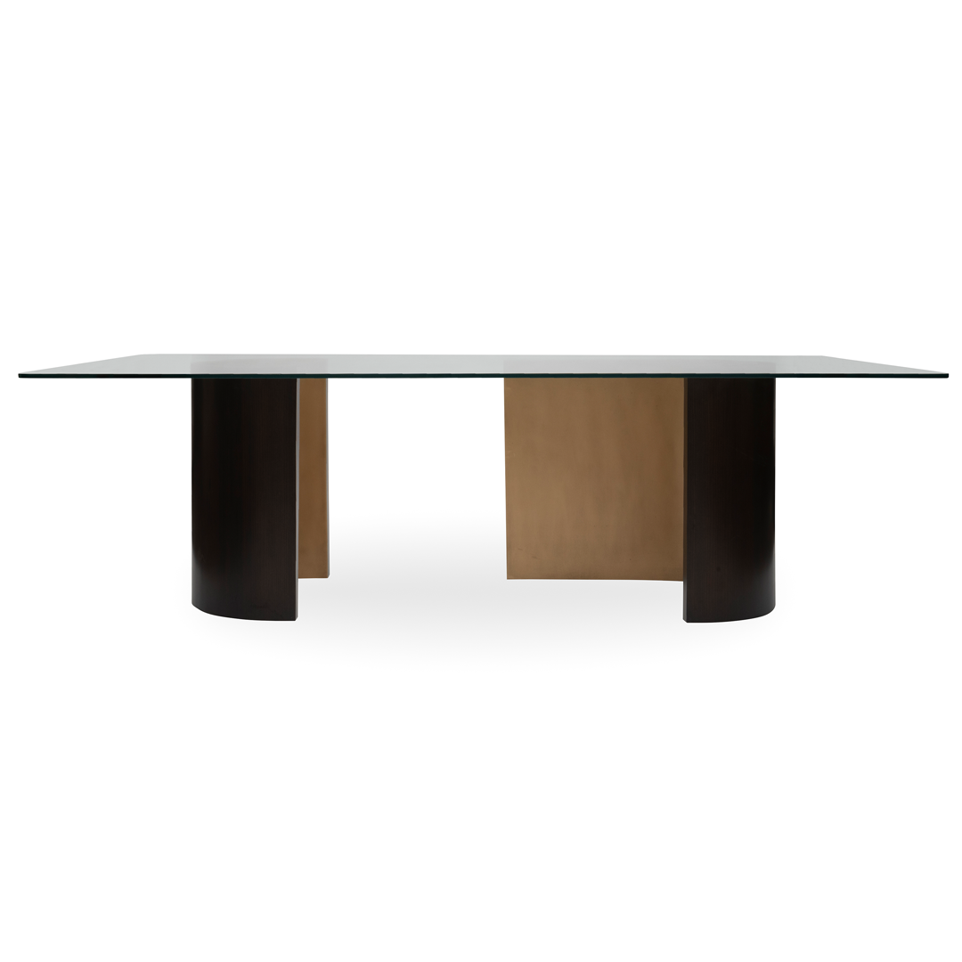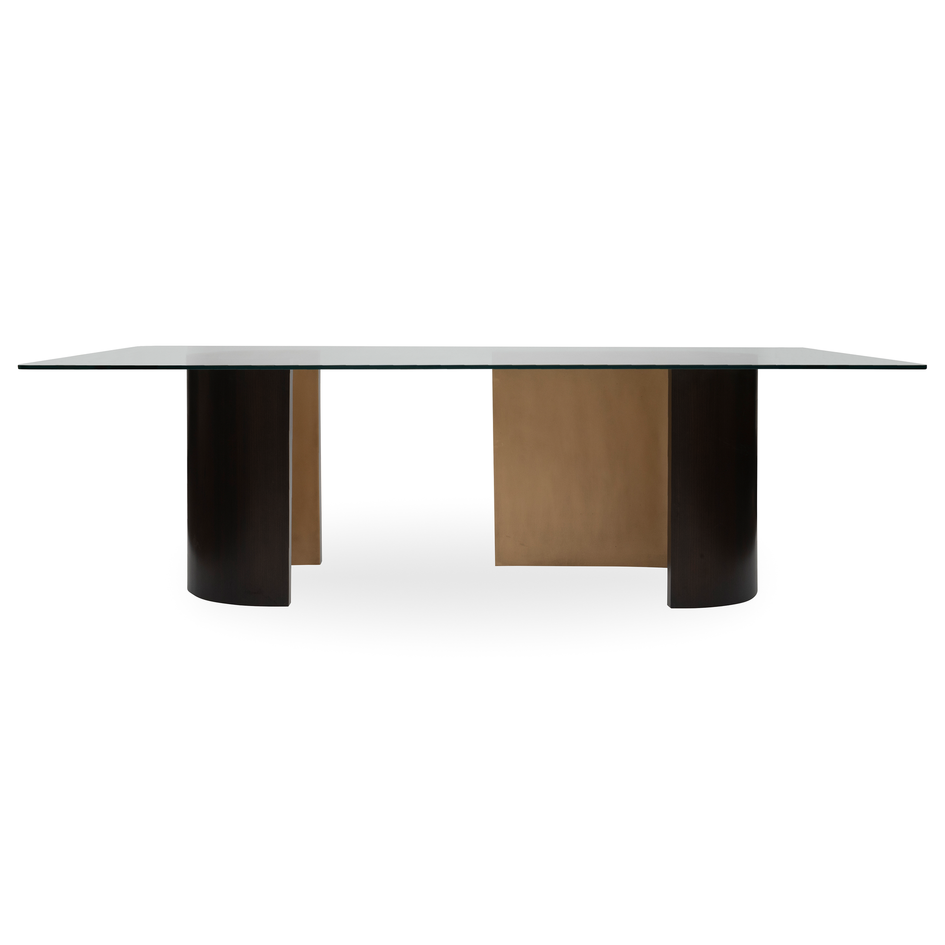 This dining table’s glass tabletop and graceful crescent-shaped legs show off the lustrous finish with a dull gold inside and weathered black on the outside. The top and base can be customized in any finish and material of your choice.