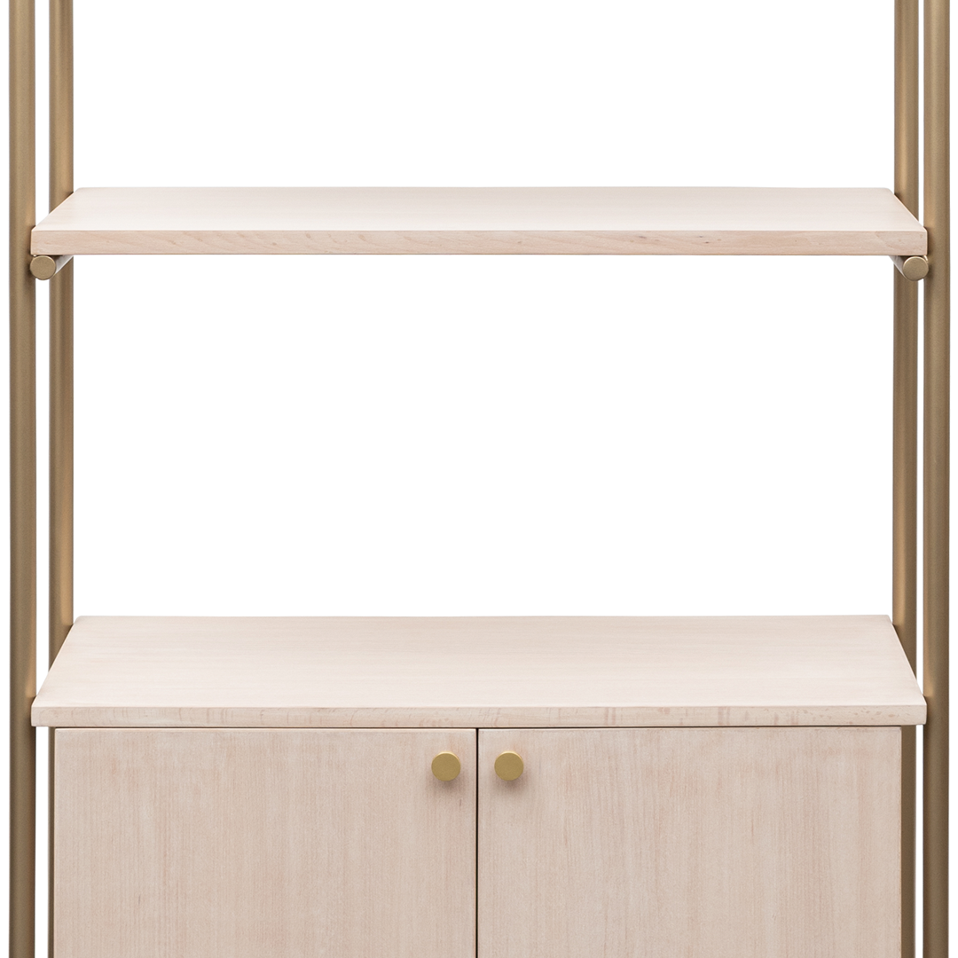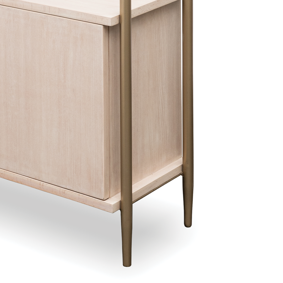 Commanding in height and refined in detail, the Lamar Shelf is a study in elevated function. Crafted in a smooth white oak finish, its open frame is anchored by brushed gold columns that introduce a quiet opulence to its clean silhouette. The generous shelves offer ample space to curate books and objects d’art, while a discreet lower cabinet lends concealed storage without disrupting the design’s elegant rhythm. Whether placed in a study, salon, or private office, the Lamar brings thoughtful structure and timeless sophistication to the room it inhabits.