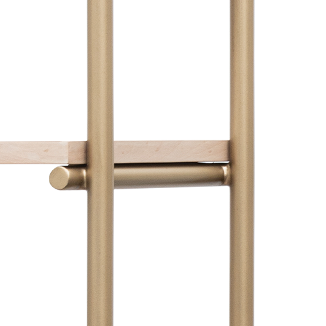 The white oak polished finish and brushed gold columns complement each other for a look that feels both tactile and chic.