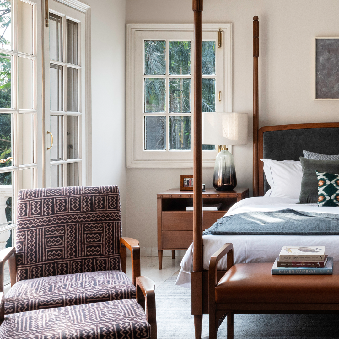 Finished in deep, burnished tones, the bedside table brings warmth and depth to the room. Its presence is serene yet commanding, perfectly at ease beside the grandeur of the Lamu four-poster bed.