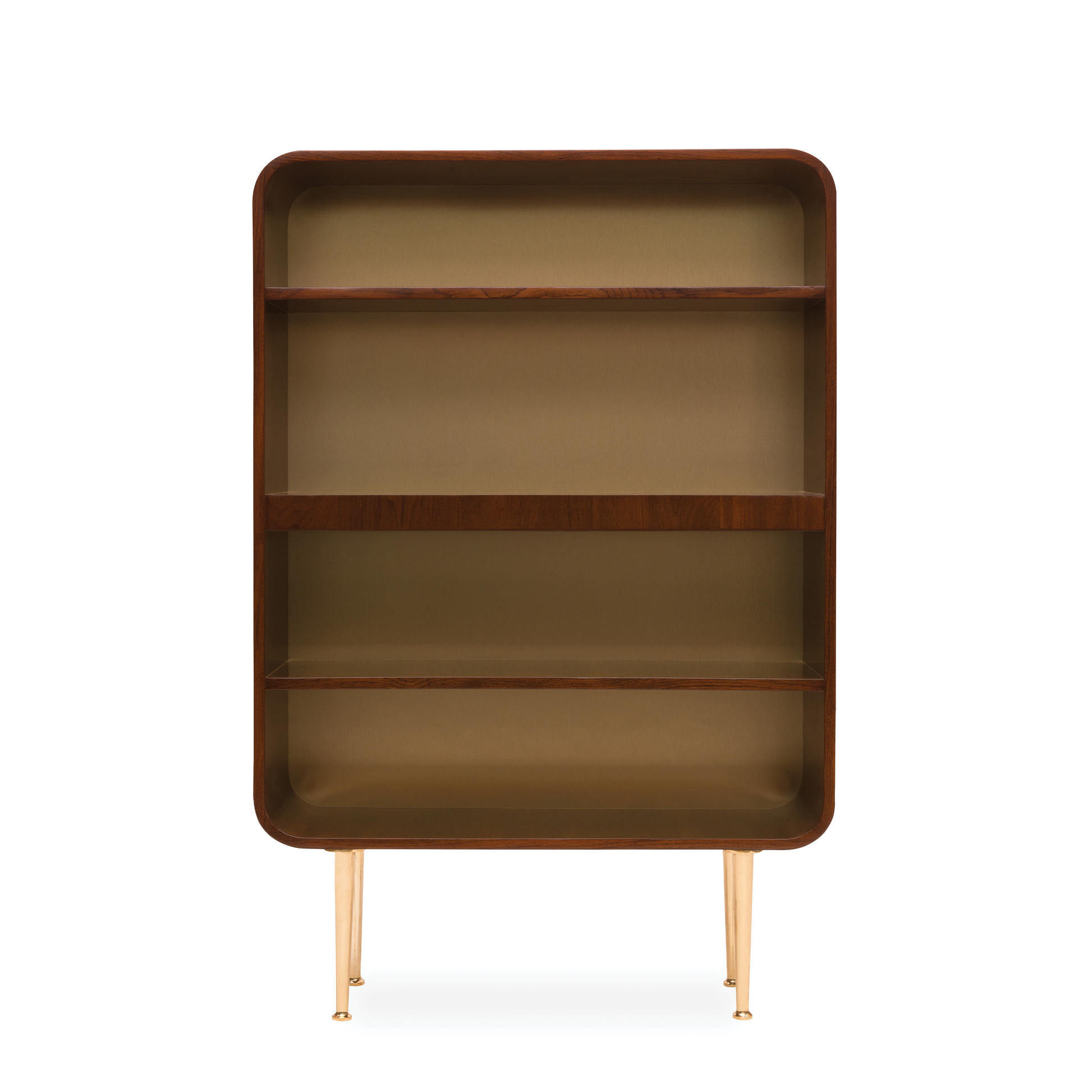 The carefully chosen veneer is offset by a brass coloured back. Fours shelves offer space for displaying books, home accents, and more.