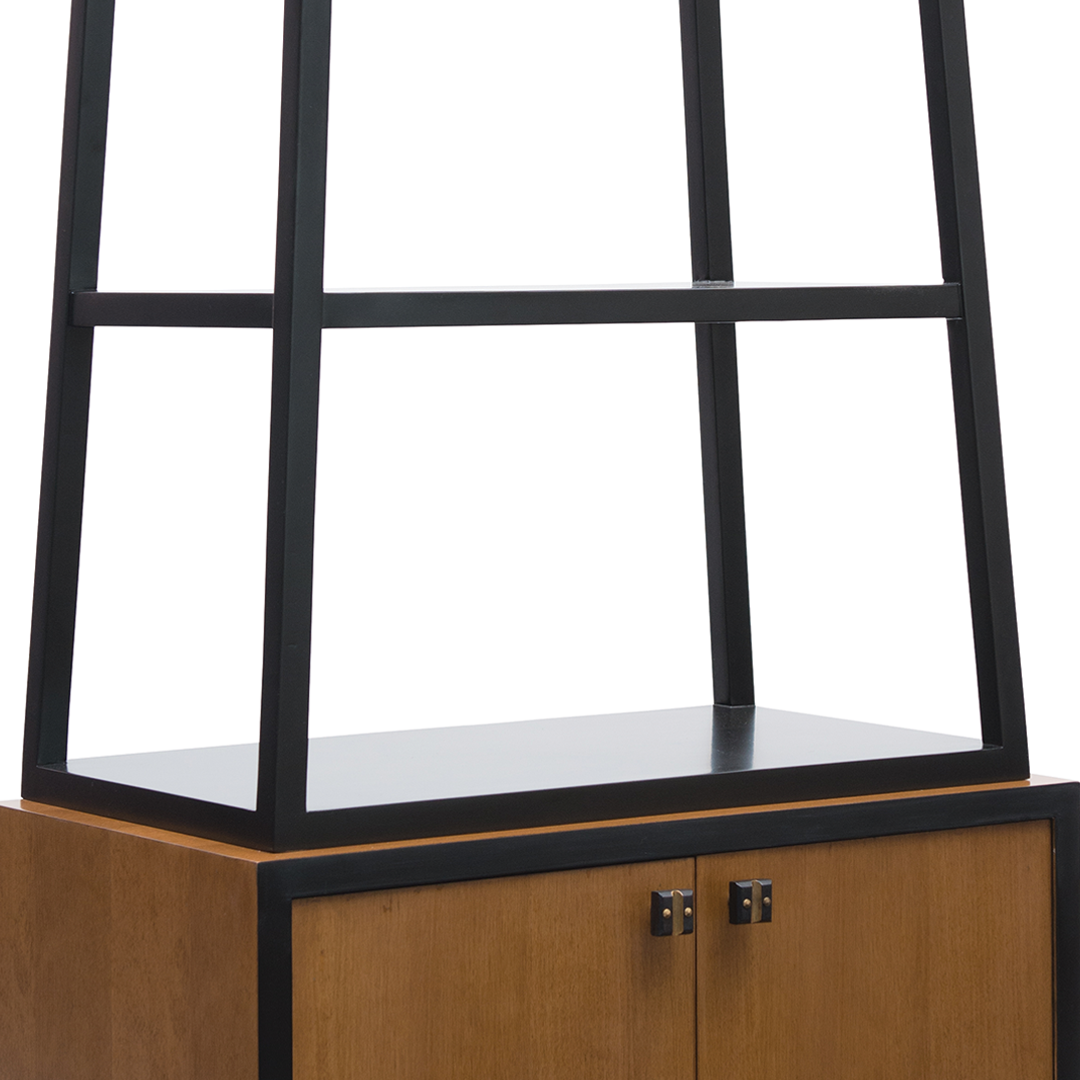 Crafted with precision, the slim frame juxtaposes a weathered black finish with the warmth of elm, creating contrast that feels both historic and modern. The result is a piece that doesn’t simply store—it showcases. Bold yet restrained, ornamental yet purposeful, the Oblique Shelf is as much about presence as it is about function.