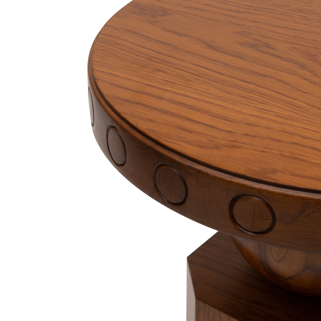 Inspired by the circular motifs of Louis Kahn’s architectural language, the Orb Side Table is built around a spherical centre and finished in bronzed oak to reveal striking wood grain. Compact yet compelling, it elevates everyday ritual.