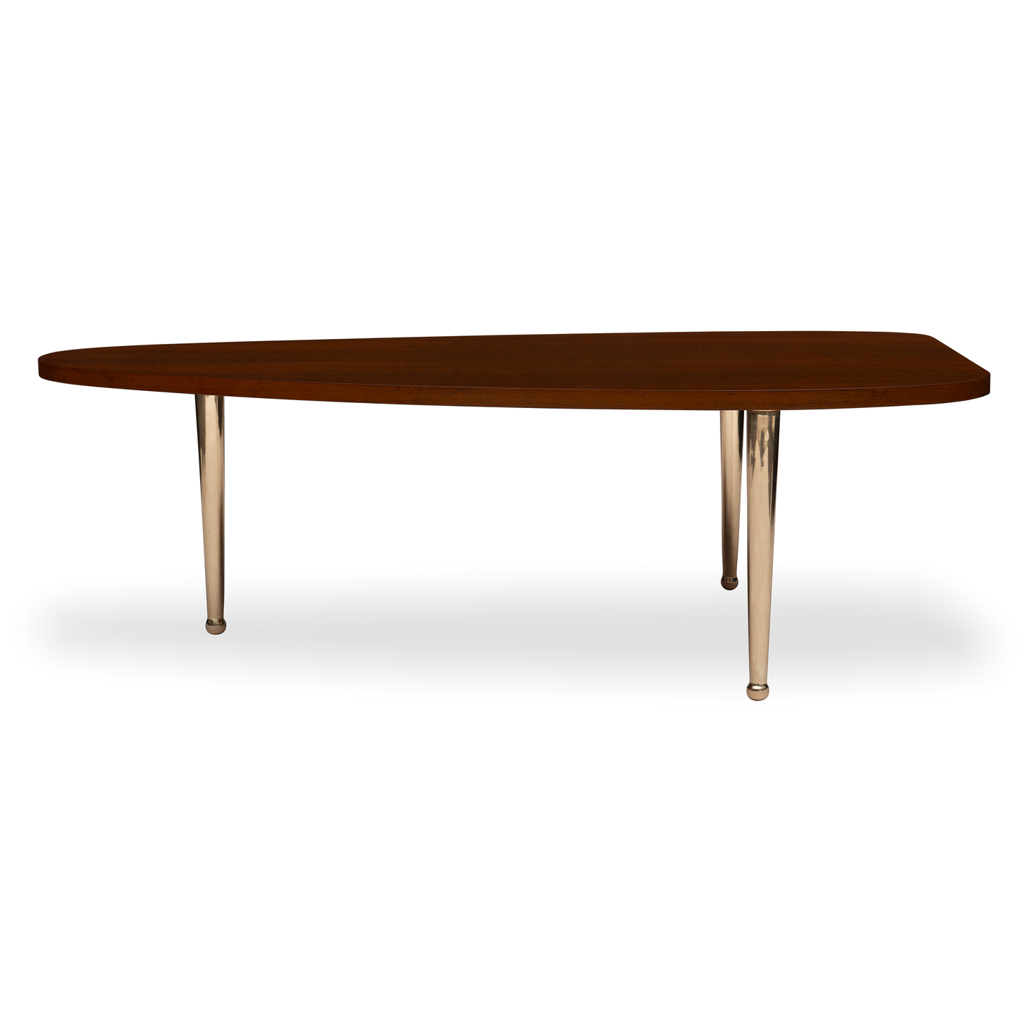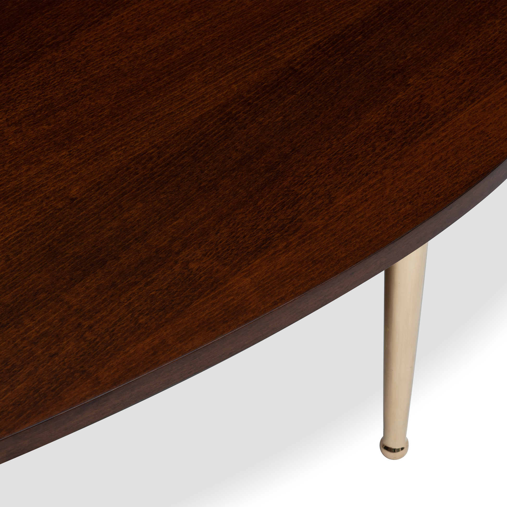 The use of polished brass legs with a 1950s design influence adds a touch of mid-century elegance and warmth, contrasting with the organic pebble shape and contemporary finishes.