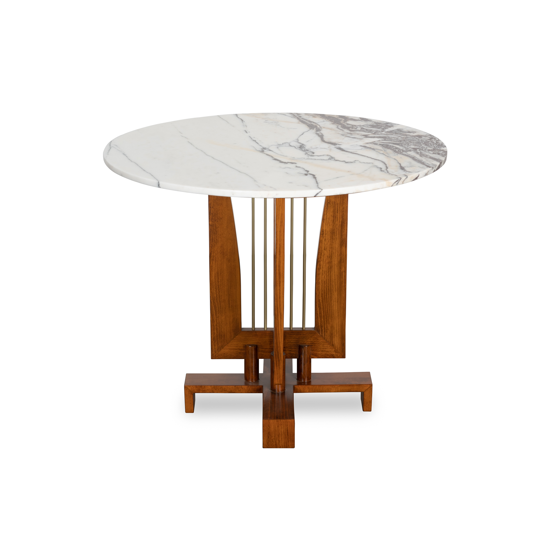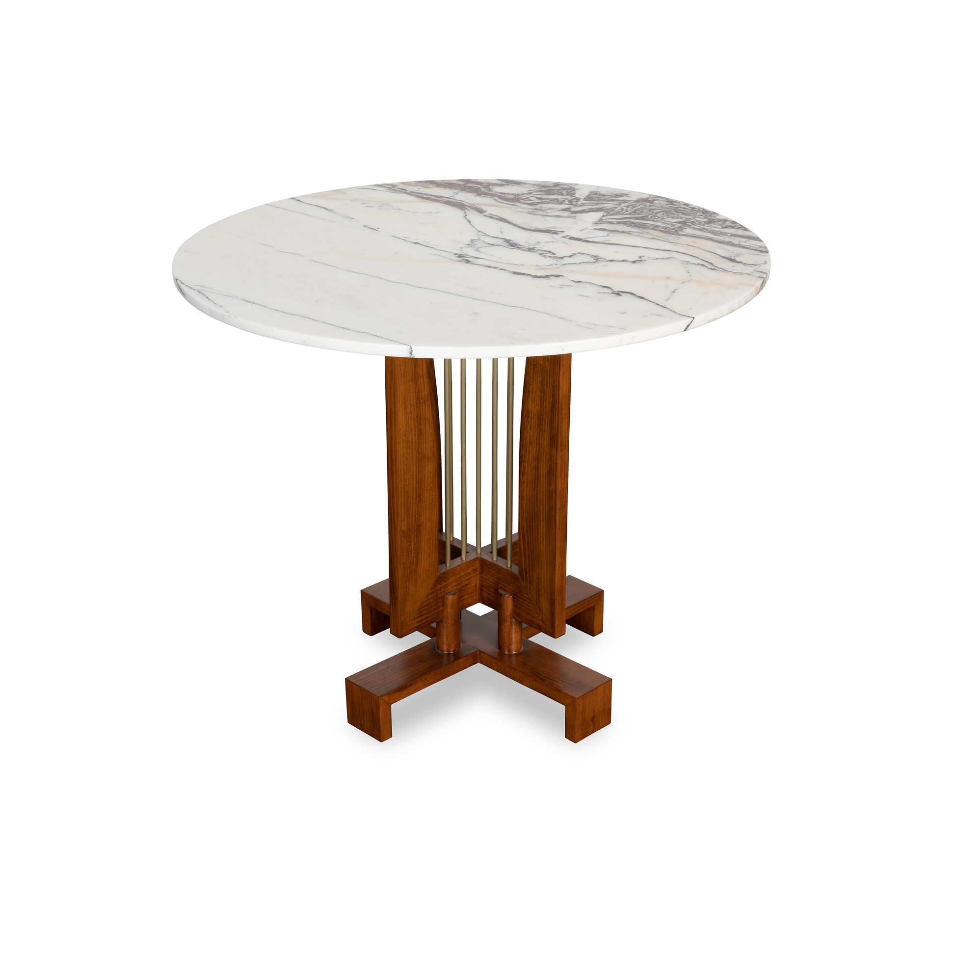 The Pilar dining table brings sophisticated Art Deco elegance to any interior. Its architectural base features striking vertical brass accents framed by warm tones, creating a dramatic foundation for your choice of tabletop. Available with either a rich wooden surface or luxurious marble top as shown, and offered in both 3' and 4' diameters to accommodate various spaces and gatherings.