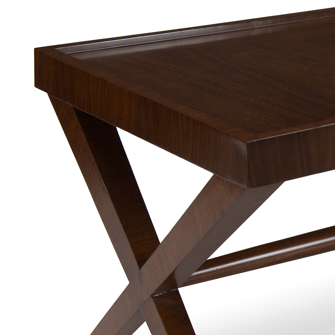 The Savoy Coffee Table bridges classic design with today’s tailored aesthetic. Its X-frame base nods to imperial formality, while a generously scaled walnut veneer top with beveled edges speaks to contemporary craftsmanship. Rich in presence and poised in form, the Savoy adapts effortlessly to settings that favor both heritage refinement and modern restraint.