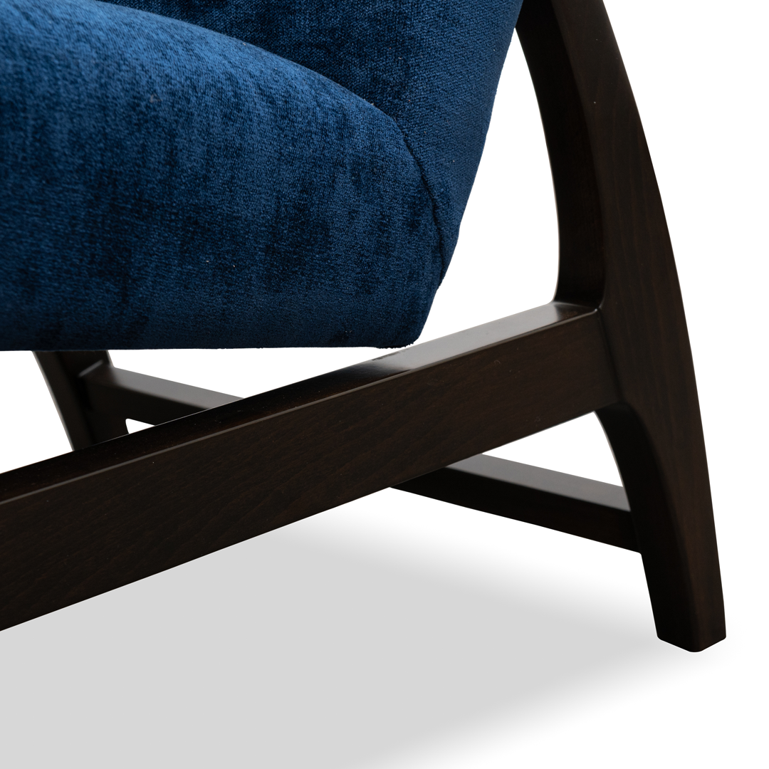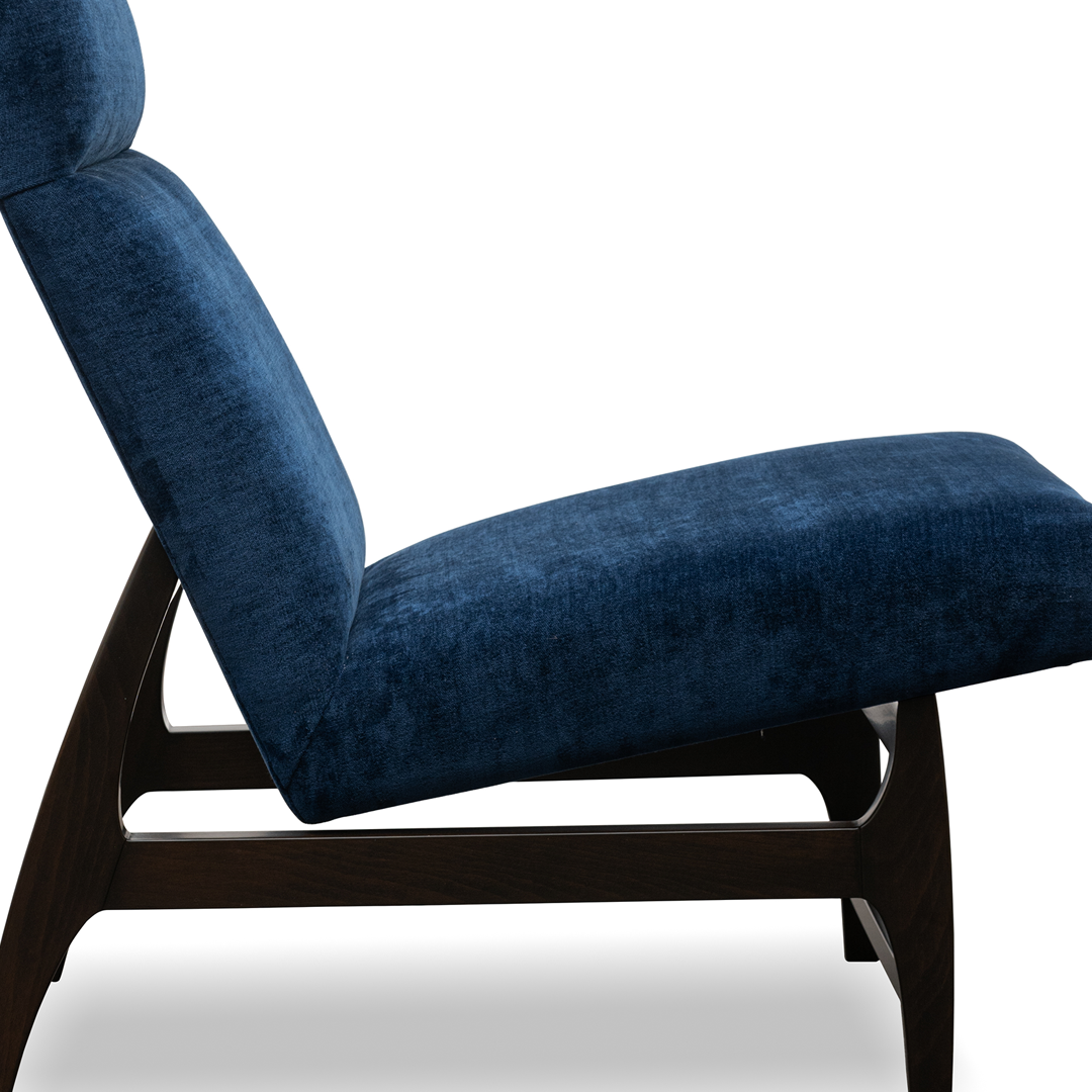 Dressed in a richly-hued fabric that catches the light like a shadowed jewel, Wayne invites both reflection and repose. The low, angular frame speaks to mid-century restraint, while the generously cushioned seat offers an invitation to linger—a piece designed not merely for comfort, but for contemplation.
